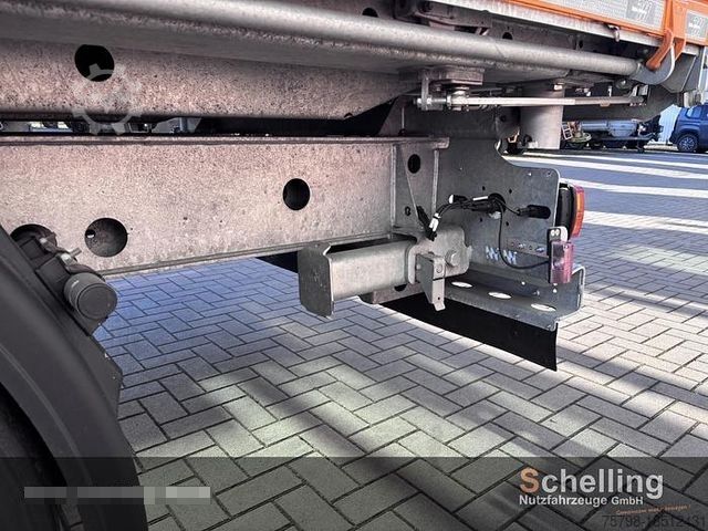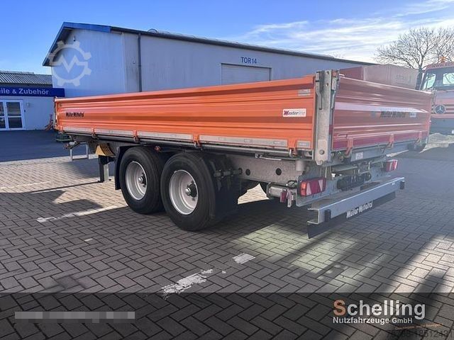 Müller Mitteltal KA-TA-R 11.9 tandem 3-way tipper with lots of extras. Total weight: 11,900kg Standard payload approx.: 8,750kg Clear dimensions: 5,000x2,420x500mm Tires: 385/55R19.5 4-layer paintwork, single color Wheels: silver Chassis/underbody protection: hot-dip galvanized Platform with bulkhead: hot-dip galvanized Axles/springs/fuel tank etc.: black Side and rear wall: RAL 2011 deep orange Reinforced and certified structure in accordance with EN 12642 XL including load securing certificate. (Only in conjunction with 500mm high steel side walls). Rear stanchions screwed, hot-dip galvanized, without top coat. Lashing points LC 5,000 daN recessed at the front. Net hooks integrated at the side and rear in the bearings of the central locking system to the base side wall and 2 additional pieces on the front wall. BPW axles instead of GIANT tipping platform with permanently attached front wall in hot-dip galvanized design, with screwed, galvanized rear stanchions, without additional coating (not with HARDOX floor). Due to the system, the formation of waves during hot-dip galvanization, especially with the large floor panel, cannot be ruled out; complaints in this regard are excluded from the warranty. Tires 385/55R19.5 instead of 235/75R17.5 (floor and coupling height + approx. 110 mm, Code 08.940 ramp length 3,570 mm required). 1 plastic tool box, black, lockable, W=750xH=350xD=300mm (45kg payload with even load), arrangement: on the chassis frame on the right in the direction of travel. 1 pair of aluminum docking ramps without fairway (8 t/pair), 3,570x400x105mm, suitable for rubber-tired and tracked vehicles, 55 kg/each. Two-step access in front of the front wall, on the left in the direction of travel (hot-dip galvanized). Extended connecting lines for agricultural and forestry tractors.
