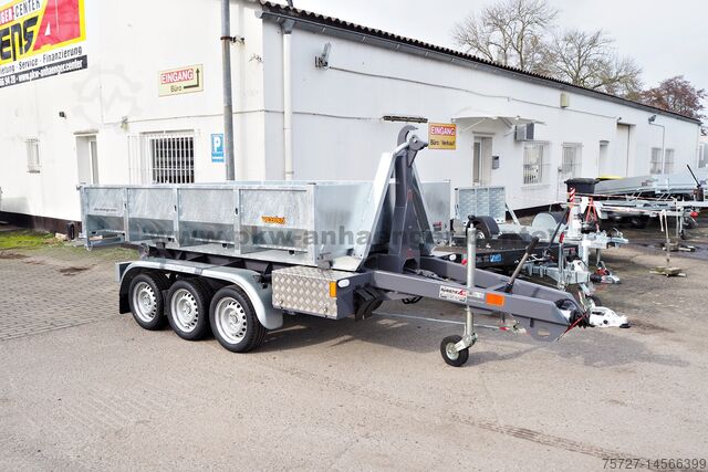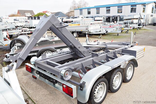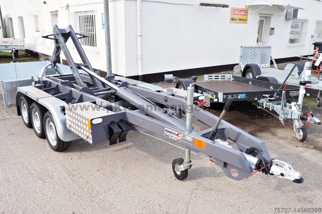 a hook with hydraulic ram, electric hydraulics and built-in battery, radio remote control, charger, 3 axles, support wheel, extremely stable welded frame and V-drawbar painted in dark gray.