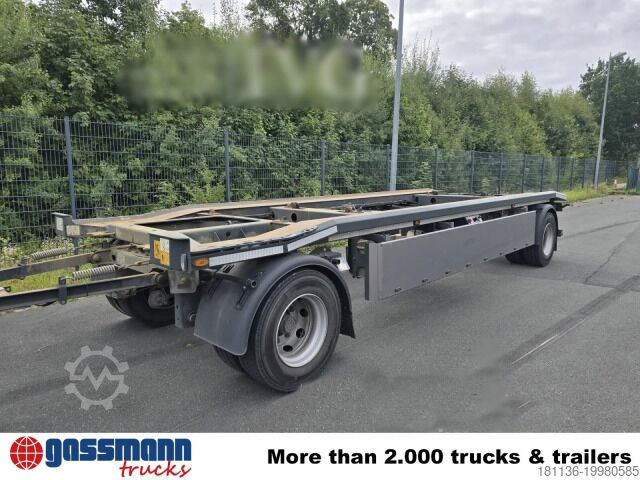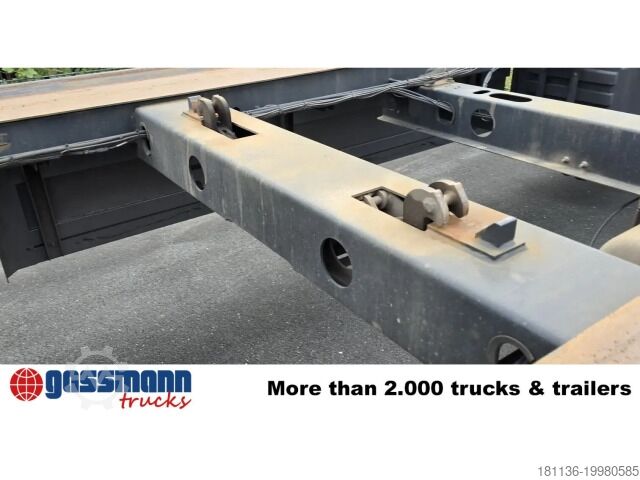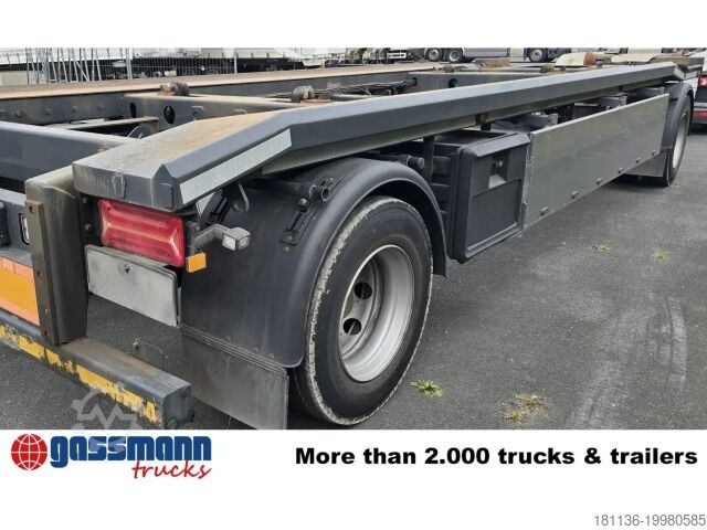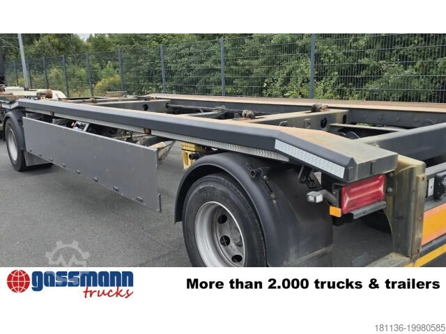 Vehicle location: in transit, 2 axles, BPW axles, turntable, air suspension, lift & lower, ABS (anti-lock braking system), container locking, underrun protection, side aluminium underrun protection, twin tyres, storage box. Body: 2-axle roll-off trailer for containers from 5m to 7m, 2x BPW axles, 2x pneumatic container locks! Approx. 112,000 km mileage! All information provided without guarantee as the trailer is in transit! ACCESSORY INFORMATION WITHOUT GUARANTEE, subject to change, prior sale, and errors excepted!