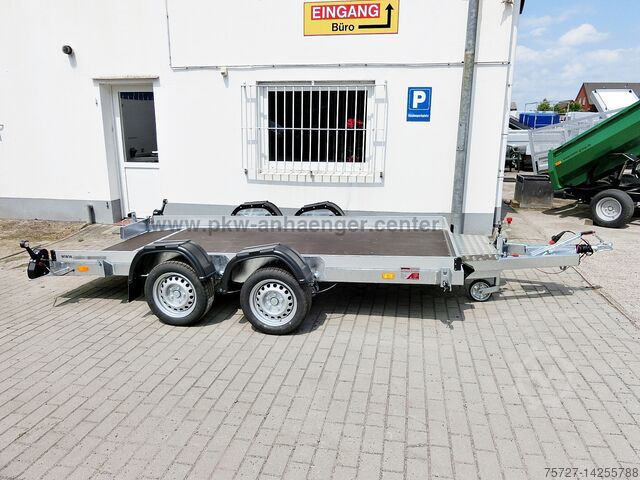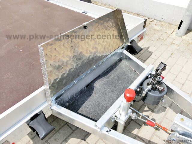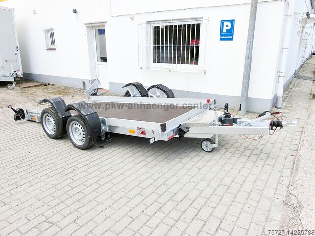 Vehicles* can be easily loaded* with a *lowerable car trailer*. *The *platform* is lifted by *manual hydraulics* and lowered by opening the valve of the *manual pump*. This means that platforms, lifting platforms, lifting platforms, pallets*, *lawnmowers*, *machinery*, construction machinery, *motorcycles*, *quads* and *ATVs* can be easily driven on the *car trailer*.
