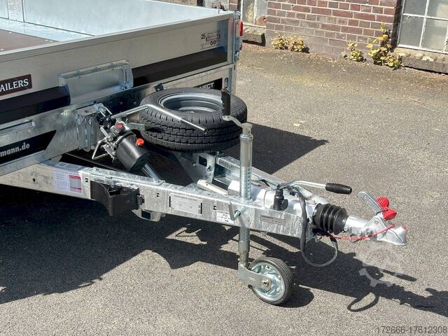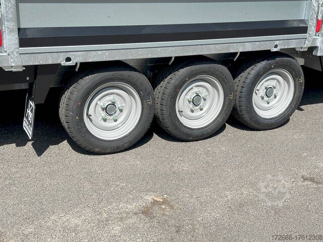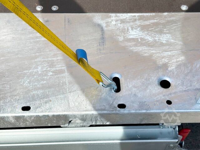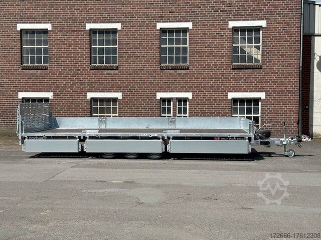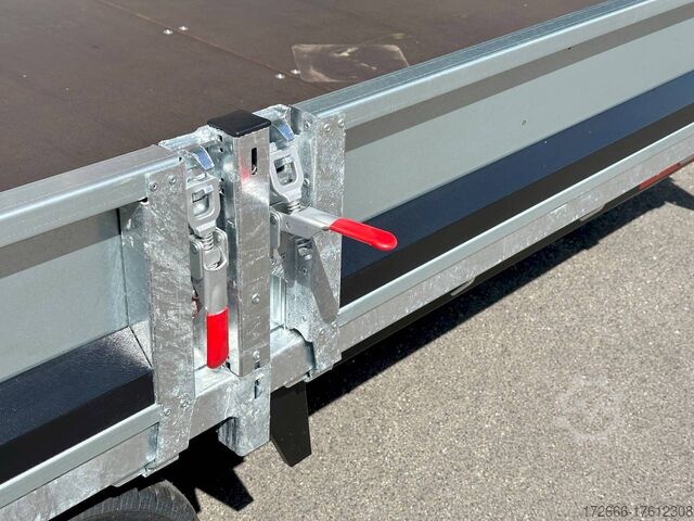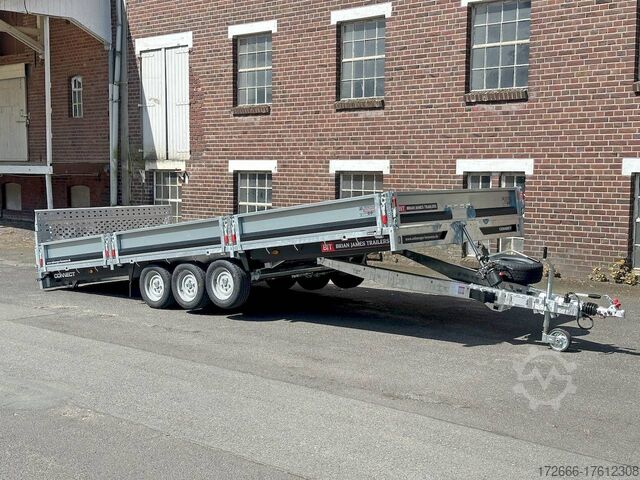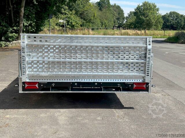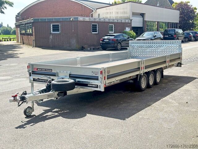 Automatic reverse drive, tiltable cargo bed / drop sides / multifunctional trailer / ramp shaft / perforated lashing floor, hot-dip galvanized, * IMMEDIATELY AVAILABLE * incl. tiltable loading area / drop sides / multifunctional trailer / ramp shaft / perforated lashing floor TECHNICAL DATA - Make: Brian James - Model: Connect 476 - Vehicle type: High loader - Vehicle condition: New vehicle - Initial registration: Without initial registration - TÜV/HU: 2 years from initial registration - Internal dimensions (L x W x H): 550 x 227 x 30 cm - External dimensions (L x W x H): 717 x 229 x 125 cm - Loading height of floor: 65 cm - Perm. Total weight: 3,500 kg - Unladen weight: 1,207 kg - Payload: 2,293 kg - Chassis: High loader (wheels under the body) - Tires: 195/60R12C - Chassis: ALKO rubber suspension axle - Support wheel: Yes - 100km/h approval: Optional, can be retrofitted DESCRIPTION - Steel drop sides 35cm, fold-down, removable incl. Click & Clamp system, with automatically adjustable stanchions and clampable drop sides - most adaptable multifunctional trailer for commercial goods and vehicle transport of all kinds. - Every available option can be flexibly attached or detached and thus enables customization for almost any application - perforated steel lashing floor in combination with 18 mm multiplex floor offers high slip resistance and is extremely wear-resistant, even under the toughest operating conditions. - Can be plugged in at all 4 corners for drop sides, tarpaulin frames, drop side extensions or front wall extensions - vehicle can also be fitted with all options after purchase: enormous potential for retrofitting. - very sturdy welded steel frame - contact edge for drive-on ramps can be moved for different track widths - numerous lashing points punched directly into the frame enable professional load securing - tiltable loading area with manual hydraulic hand pump - continuous perforated steel drive-on ramp, galvanized steel, folding heavy-duty drive-on ramp, incl. spring support - integrated ramp shafts for easy retrofitting of drive-on ramps - side panels color: black - frame completely hot-dip galvanized - rod shafts for easy retrofitting of drive-on ramps Sturdy net hooks under the loading area - Spare wheel mounted on the drawbar for easy access - Automatic reverse - ALKO overrun device and parking brake - Cast steel coupling head with integrated ALKO high-security lock - Very sturdy V-drawbar REINFORCED - 13-pin plug - Reversing lights - Large LED safety lighting - Complete LED lighting: Extremely bright, durable and reliable. - dynamic LED indicators are clearly visible even in bad weather - robust protection for the rear lights - integrated rear fog light - various front, side and rear marker lights - heavy-duty support wheel - 5-year chassis warranty Accessories can be retrofitted - please enquire! - Storage box - Winches - Attachments New vehicle with warranty and TÜV. We are happy to offer you suitable financing !, Descriptions and pictures are protected by copyright !!! Over 800 trailers immediately available for you! We are for over 30 years Brian James / Humbaur / Hapert / Unsinn / Cheval Liberte / Koch / Debon / Stedele / TPV / Tohaco / Vezeko / Variant / Vlemmix - specialized dealer & repair - workshop - delivery Germany-wide with surcharge possible! Anhänger Zentrum BAUMANN GmbH Dinxperloer Str. 389 46399 Bocholt - Errors, omissions and prior sale excepted -