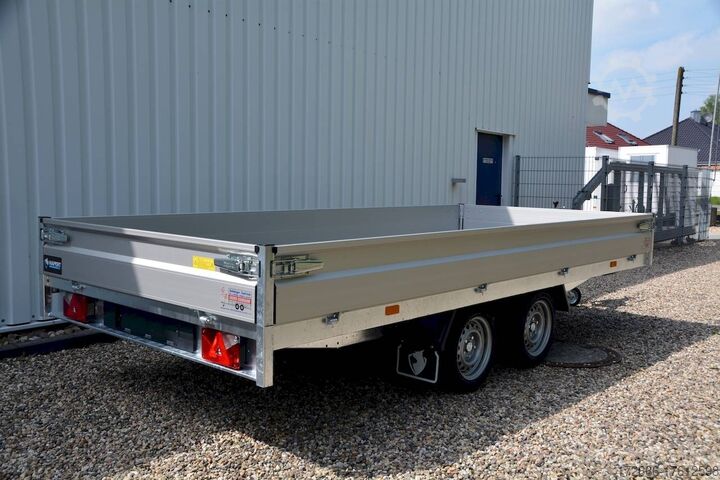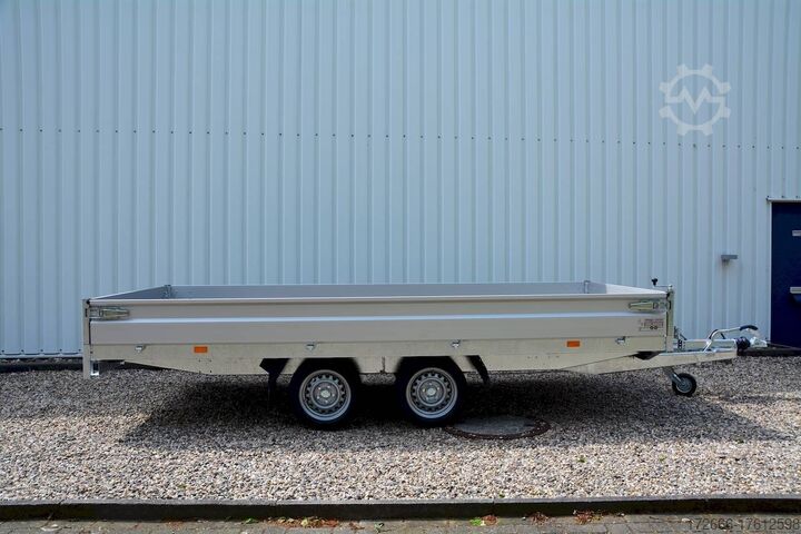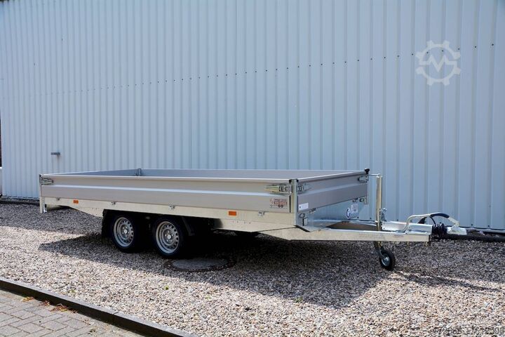 Hydraulics, automatic reversing, hot-dip galvanized, unbraked, * IMMEDIATELY AVAILABLE * Technical data: - Type: New vehicle with 2 years TÜV from first registration - TÜV: 2 years - Floor: Multiplex screen printing with anti-slip surface - Gross vehicle weight: 2,700 kg - Unladen weight: 564 kg - Payload: 2.136 kg - Interior dimensions: 405 x 180 x 30 cm (L x W x H) - Exterior dimensions: 537 x 186 x 94 cm (L x W x H) - Loading sill height: 64 cm - Tires: 195/50R13 steel rim - Brake: yes - Support wheel: yes, automatic - Incl. vehicle documents (letter) - 100 km/h at extra charge Standard equipment: - Designed side wall hinges for very easy attachment of a cargo net - 30 cm high aluminum side walls with robust built-in locks - Hinged front wall. Tethering hooks on the chassis. - U-profile at the rear for easier attachment of the ramps, - double-walled anodized aluminium drop sides - all drop sides foldable and removable - removable steel corner stanchions - multiplex wooden floor with anti-slip surface - very sturdy welded steel frame - frame completely hot-dip galvanized - many cross members for high point loading - additional longitudinal struts welded in throughout - all cross and longitudinal members rest on the floor - 8 lashing brackets recessed inside the side edge (1000DaN / kg) TÜV certified! - Lashing hooks on lower hinge parts - Maintenance-free rubber spring axle from KNOTT - Automatic reverse - KNOTT overrun device and parking brake - Sturdy eccentric locks - Reinforced, sturdy bolted V-drawbar - 13-pin plug - Large safety lighting Large dimensioned safety lighting - Lighting recessed in the rear frame, integrated rear fog light - Automatic support wheel in the middle Special equipment included in the price : - Low chassis, tires 195/50R13C, loading floor height : approx. 64cm Accessories optionally available, as partly shown in the pictures: - High front grille, 70cm - Tarpaulin + bows - Supports, grilles, side wall attachments, nets etc. New vehicle with warranty and TÜV. We are happy to offer you suitable financing !, Descriptions and pictures are protected by copyright !!! Over 800 trailers immediately available for you! We are for over 30 years Brian James / Humbaur / Hapert / Unsinn / Cheval Liberte / Koch / Debon / Stedele / TPV / Tohaco / Vezeko / Variant / Vlemmix - specialized dealer & repair - workshop - delivery Germany-wide with surcharge possible! Anhänger Zentrum BAUMANN GmbH Dinxperloer Str. 389 46399 Bocholt - Errors, omissions and prior sale excepted -