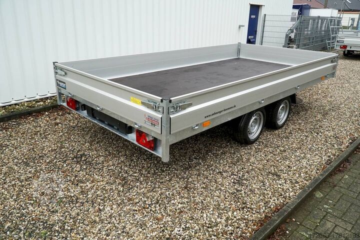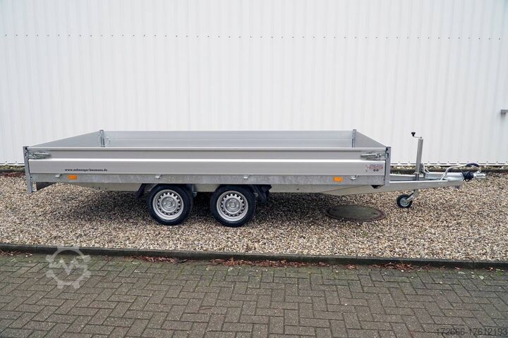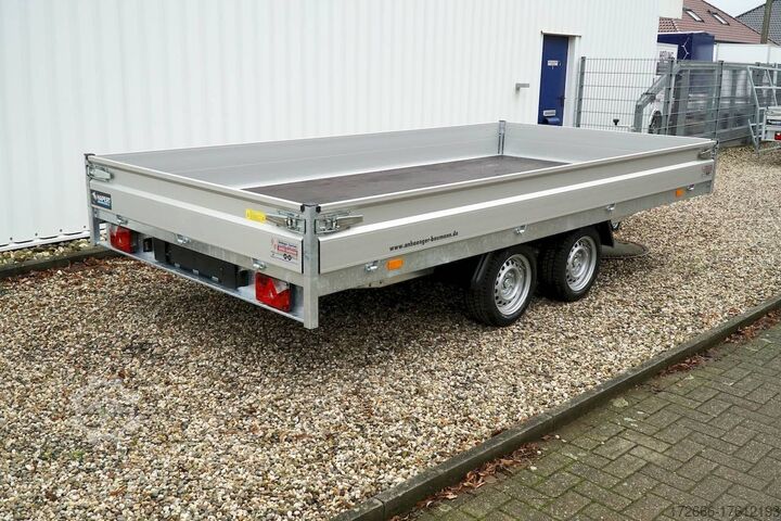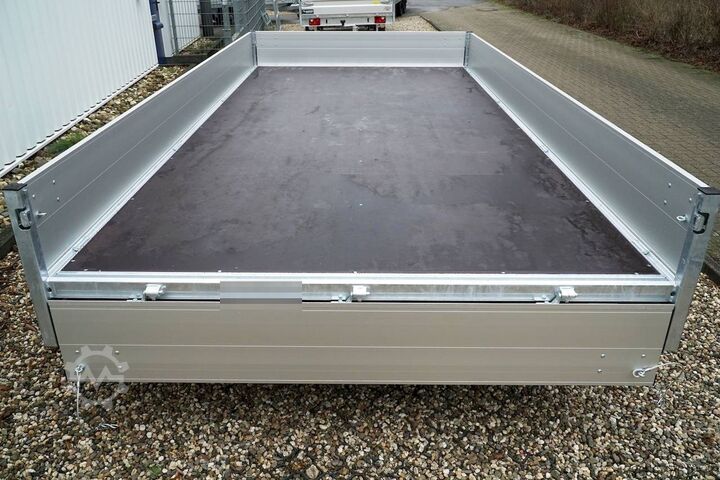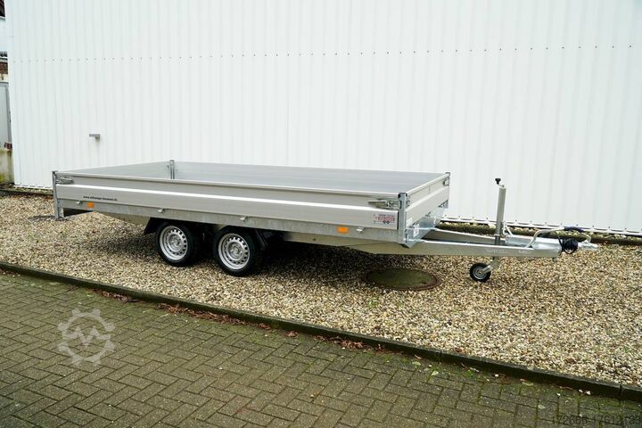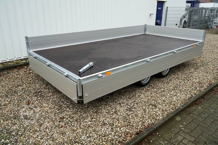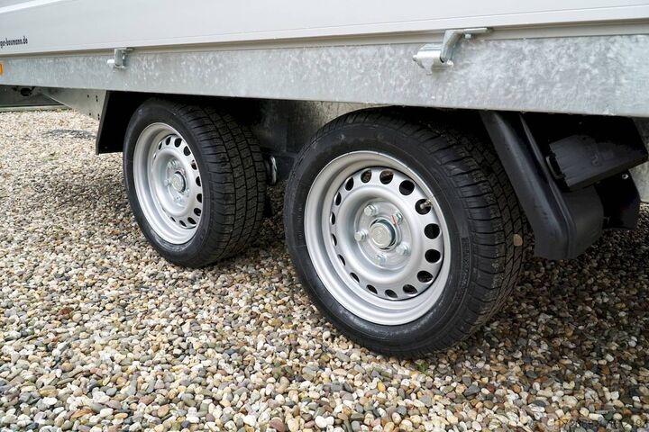 Hydraulics, automatic reversing, hot-dip galvanized, unbraked, * IMMEDIATELY AVAILABLE * Technical data: - Type: New vehicle with 2 years TÜV from first registration - Availability: Immediately available - TÜV: 2 years - Floor: Multiplex screen printing with anti-slip surface - Gross vehicle weight: 2,700 kg - Unladen weight: 590 kg - Payload: 2.110 kg - Internal dimensions: 405 x 200 x 30 cm (L x W x H) - External dimensions: 561 x 206 x 94 cm - Loading sill height: 64 cm - Tires: 195/50R13C steel rim - Brake: yes - Support wheel: yes, automatic - Incl. vehicle documents (letter) - 100 km/h for an extra charge Standard equipment: - Designed side wall hinges for very easy attachment of a cargo net - 30 cm high aluminum side walls with robust built-in locks - Hinged front wall. Tethering hooks on the chassis. - U-profile at the rear for easier attachment of the ramps, - double-walled anodized aluminium drop sides - all drop sides foldable and removable - removable steel corner stanchions - multiplex wooden floor with anti-slip surface - very sturdy welded steel frame - frame completely hot-dip galvanized - many cross members for high point loading - additional longitudinal struts welded in throughout - all cross and longitudinal members rest on the floor - 8 lashing brackets recessed inside the side edge (1000DaN / kg) TÜV certified! - Maintenance-free rubber spring axle from BPW - Automatic reverse drive - BPW overrun device and parking brake - Sturdy eccentric locks - Reinforced, sturdy bolted V-drawbar - 13-pin plug - Large safety lighting - Lighting recessed in rear frame, integrated rear fog light - Automatic center support wheel Special equipment included in the price: - Low chassis, 195/50R13C tires, loading floor height: approx. 64cm Optional accessories available, as partially shown in the pictures: - High front grille, 70cm - Tarpaulin + bows - Supports, grilles, side wall attachments, nets, etc. New vehicle with warranty and TÜV. We are happy to offer you suitable financing !, Descriptions and pictures are protected by copyright !!! Over 800 trailers immediately available for you! We are for over 30 years Brian James / Humbaur / Hapert / Unsinn / Cheval Liberte / Koch / Debon / Stedele / TPV / Tohaco / Vezeko / Variant / Vlemmix - specialized dealer & repair - workshop - delivery Germany-wide with surcharge possible! Anhänger Zentrum BAUMANN GmbH Dinxperloer Str. 389 46399 Bocholt - Errors, omissions and prior sale excepted -