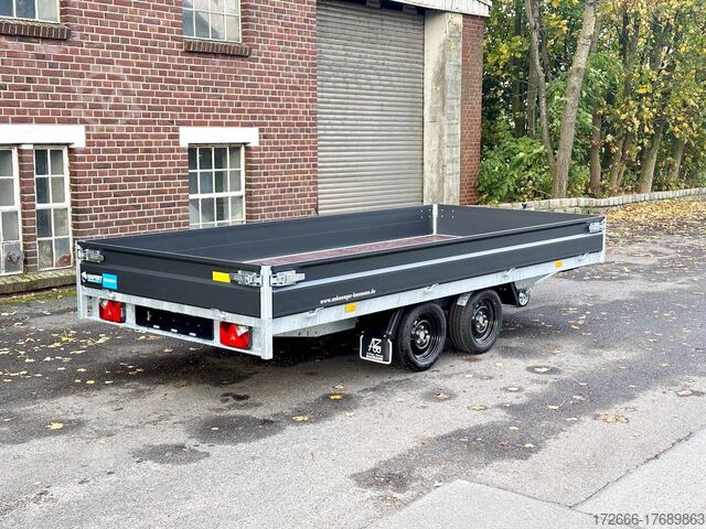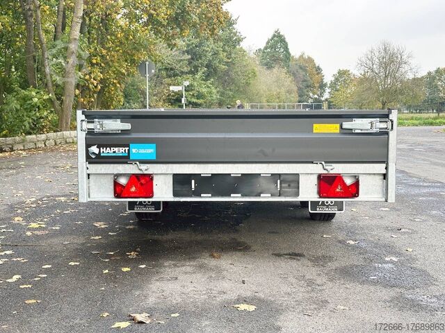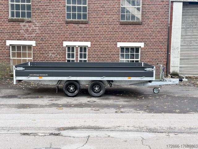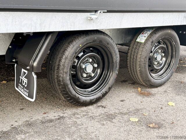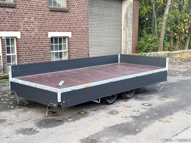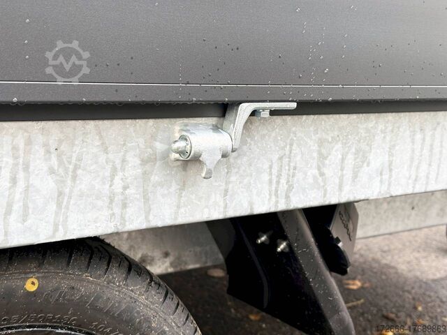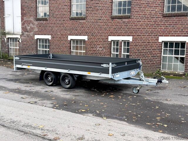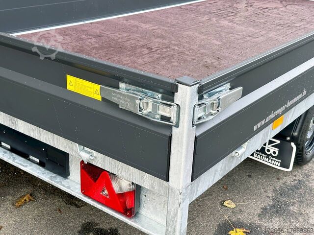 Hydraulics, automatic reverse drive, hot-dip galvanizing, unbraked, side walls KTL-coated anthracite & rims black, * IMMEDIATELY AVAILABLE * incl. side walls KTL-coated anthracite & rims black Technical data: - Type: New vehicle with 2 years TÜV from first registration - TÜV: 2 years - Floor: Multiplex screen printing with anti-slip surface - Gross vehicle weight: 2,700 kg - Unladen weight: 574 kg - Payload: 2.126 kg - Interior dimensions: 405 x 180 x 30 cm (L x W x H) - Exterior dimensions: 537 x 186 x 94 cm (L x W x H) - Loading sill height: 64 cm - Tires: 195/50R13 steel rim - Brakes: yes - Support wheel: yes, automatic - Incl. vehicle documents (letter) - 100 km/h for an extra charge. Standard equipment: - Low chassis, tires 195/50R13C, loading floor height: approx. 64cm - Designed side wall hinges for very easy attachment of a cargo net - 30 cm high aluminium side walls with robust built-in locks - Hinged front wall. Tethering hooks on the chassis. - U-profile at the rear for easier attachment of the ramps, - double-walled anodized aluminium drop sides - all drop sides foldable and removable - removable steel corner stanchions - multiplex wooden floor with anti-slip surface - very sturdy welded steel frame - frame completely hot-dip galvanized - many cross members for high point loading - additional longitudinal struts welded in throughout - all cross and longitudinal members rest on the floor - 8 lashing brackets recessed inside the side edge (1000DaN / kg) TÜV certified! - Lashing hooks on hinged lower sections - Maintenance-free rubber spring axle - Automatic reverse - Overrun device and parking brake - Sturdy eccentric locks - Reinforced, sturdy bolted V-drawbar - 13-pin plug - Large safety lighting - Lighting recessed in rear frame, integrated rear fog light - Automatic center support wheel Accessories optionally available: - High front grille, 70cm - Tarpaulin + bows - Rear light protection grille - Rotating & crankable rear supports - Anti-theft device - Grids, side wall attachments, nets and much more. New vehicle with warranty and TÜV. We are happy to offer you suitable financing !, Descriptions and pictures are protected by copyright !!! Over 800 trailers immediately available for you! We are for over 30 years Brian James / Humbaur / Hapert / Unsinn / Cheval Liberte / Koch / Debon / Stedele / TPV / Tohaco / Vezeko / Variant / Vlemmix - specialized dealer & repair - workshop - delivery Germany-wide with surcharge possible! Anhänger Zentrum BAUMANN GmbH Dinxperloer Str. 389 46399 Bocholt - Errors, omissions and prior sale excepted -