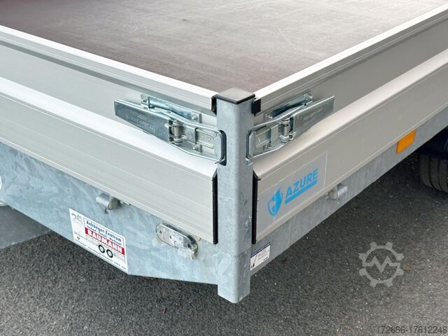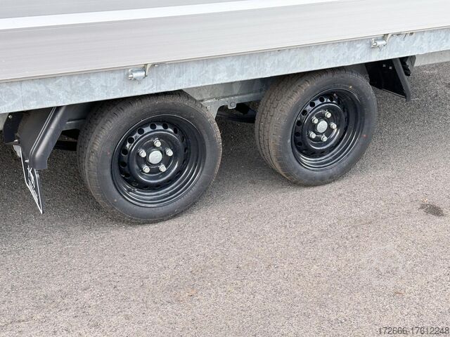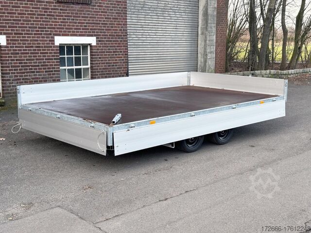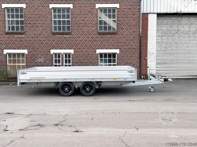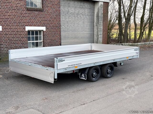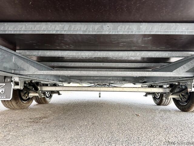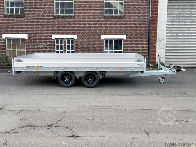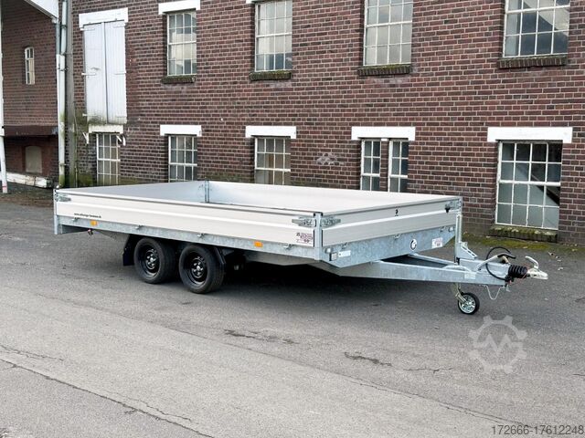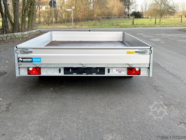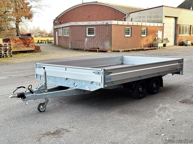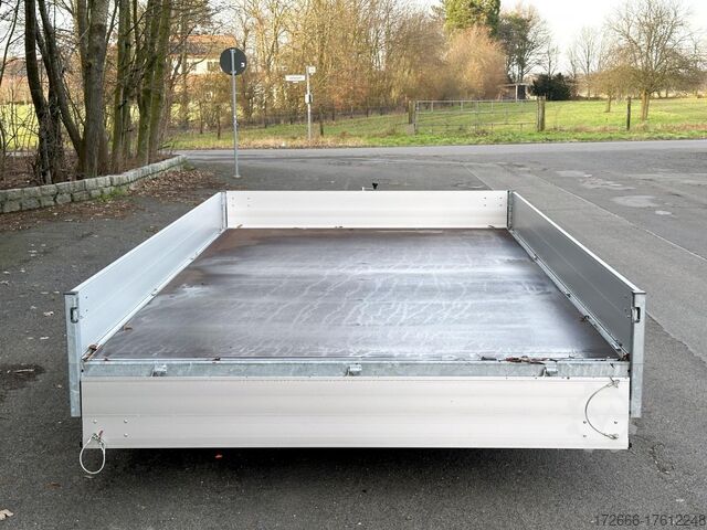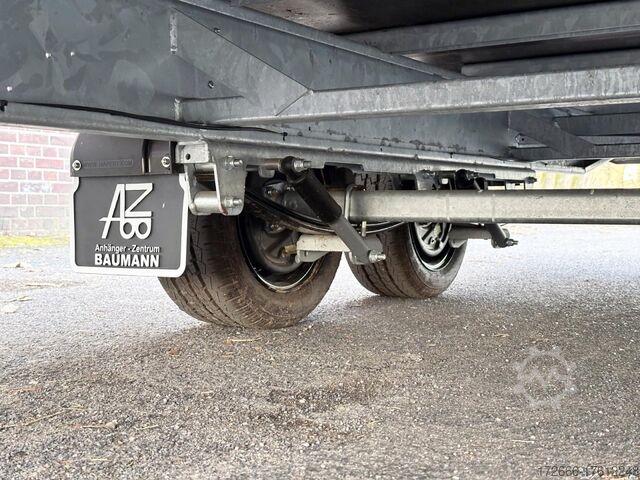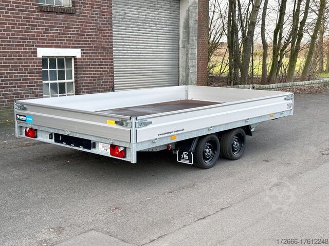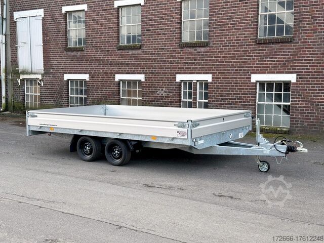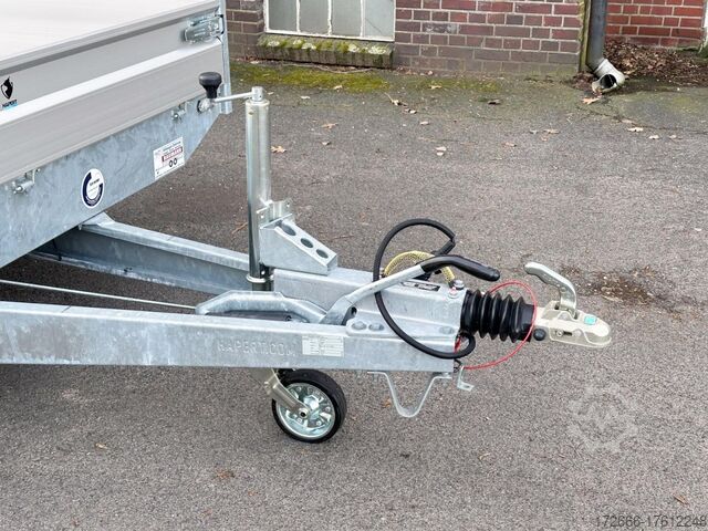 Hydraulics, automatic reversing, hot-dip galvanized, unbraked, * IMMEDIATELY AVAILABLE * Technical data: - Type: New vehicle with 2 years TÜV from first registration - Availability: Immediately available - TÜV: 2 years - Floor: Multiplex screen printing with anti-slip surface - Gross vehicle weight: 3,500 kg - Unladen weight: 740 kg - Payload: 2.760 kg - Internal dimensions: 405 x 240 x 30 cm (L x W x H) - External dimensions: 561 x 246 x 94 cm (L x W x H) - Loading sill height: 64 cm - Tires: 195/50R13C steel rim - Brake: yes - Support wheel: yes, automatic - Incl. vehicle documents (letter) - 100 km/h: INCLUSIVE Standard equipment: - New dropside hinges incl. welded-on hooks for attaching a cargo net, among other things. - Aluminium drop sides with robust built-in locks - Anodized double-walled aluminium drop sides - All drop sides foldable and removable - Removable steel corner stanchions - Insertion option at all 4 corners for tarpaulin frames, lattice attachment, drop side attachments or front wall extension - Sturdy eccentric locks - Screen-printed wooden floor, continuous without impact, non-slip and waterproof - Reinforced, sturdy bolted V-drawbar - Very sturdy welded steel frame - Frame completely hot-dip galvanized - Many standard features: - Many standard features: - New drop side hinges incl. welded hooks for attaching, for example, a cargo net. hot-dip galvanized - many cross beams therefore high point load - additional longitudinal struts welded in throughout - all cross and longitudinal beams rest on the floor - 8 lashing brackets recessed inside the side edge (1000DaN/kg) TÜV certified! - U-profile at the rear for easier attachment of the ramps - cargo net hooks on the lower hinge sections - parabolic spring axle from KNOTT - wheel shock absorbers for 100 km/h fitted - parabolic spring axle for absolute driving comfort! - Automatic reverse drive - KNOTT overrun device and parking brake - 13-pin plug - reversing lights - large safety lighting - integrated rear fog light - lighting recessed in the rear frame - automatic support wheel in the middle Special equipment included in the price : - Low chassis with 195/50R13C tires, loading floor height approx. 64cm - Parabolic suspension incl. shock absorber for 100km/h mounted instead of rubber-sprung axles - Parabolic suspension axle with shock absorber for absolute driving comfort! Optional accessories available, some of which can be seen in the pictures: - High front grille, 100cm - Tarpaulin + bows - Supports, grilles, side wall attachments, nets etc. New vehicle with warranty and TÜV. We are happy to offer you suitable financing !, Descriptions and pictures are protected by copyright !!! Over 800 trailers immediately available for you! We are for over 30 years Brian James / Humbaur / Hapert / Unsinn / Cheval Liberte / Koch / Debon / Stedele / TPV / Tohaco / Vezeko / Variant / Vlemmix - specialized dealer & repair - workshop - delivery Germany-wide with surcharge possible! Anhänger Zentrum BAUMANN GmbH Dinxperloer Str. 389 46399 Bocholt - Errors, omissions and prior sale excepted -