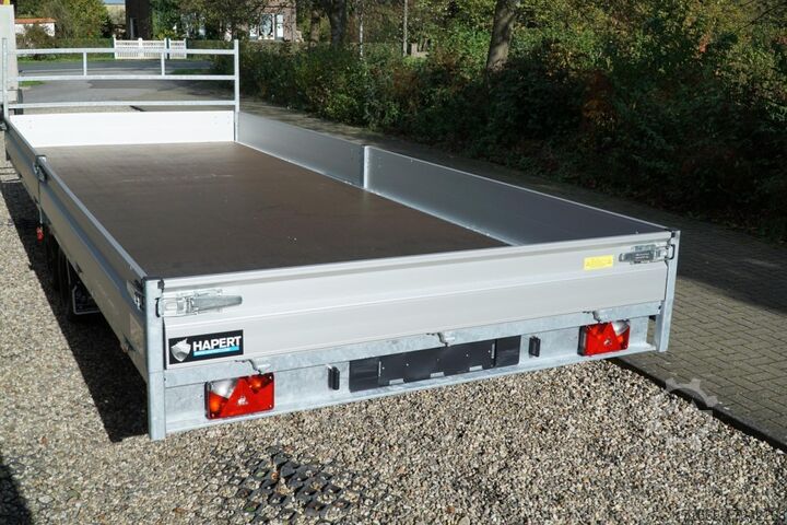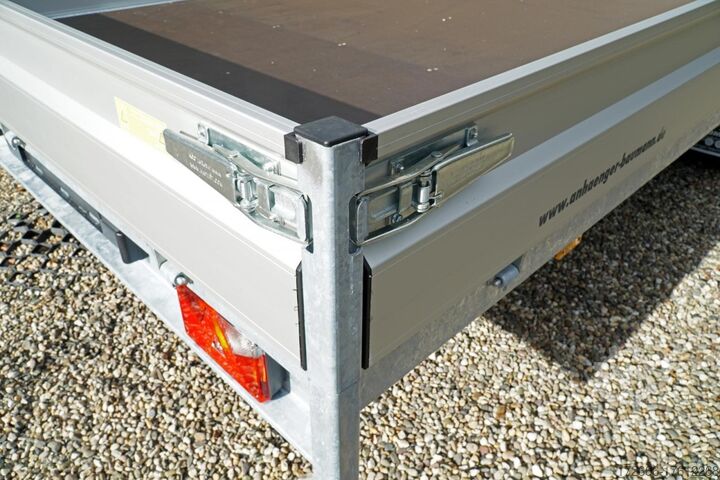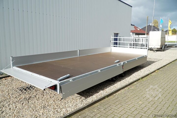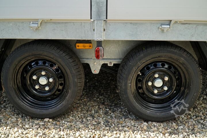Hydraulics, automatic reversing, hot-dip galvanized, unbraked, * IMMEDIATELY AVAILABLE * Technical data: - Type: New vehicle with 2 years TÜV from first registration - Availability: Immediately available!!! - TÜV: 2 years - Floor: Multiplex screen printing with anti-slip surface - Gross vehicle weight: 3,500 kg - Unladen weight: 886 kg - Payload: 2,614 kg - Interior dimensions: 605 x 220 x 30 cm (L x W x H) - Exterior dimensions: 761 x 226 x94 cm (L x W x H) - Loading sill height: 64 cm - Tires: 195/50R13C steel rim - Brake: yes - Support wheel: yes, automatic - Incl. vehicle documents (letter) Vehicle documents (letter) - 100 km/h INCLUSIVE Standard equipment: - Designed side wall hinges for very easy attachment of a cargo net - 30 cm high aluminum side walls with robust built-in locks - Hinged front wall. Tethering hooks on the chassis. - U-profile at the rear for easier attachment of the loading rails, - double-walled anodized aluminium drop sides - all drop sides foldable and removable - removable steel corner stanchions - multiplex wooden floor with anti-slip surface - very sturdy welded steel frame - frame completely hot-dip galvanized - many cross members for high point loading - additional longitudinal struts welded in throughout - all cross and longitudinal members rest on the floor - 12 lashing brackets recessed inside the side edge (1000DaN / kg) TÜV certified! - Automatic reverse drive - Knott overrun device and parking brake - Sturdy eccentric locks - Reinforced, sturdy bolted V-drawbar - 13-pin plug - Large safety lighting - Lighting recessed in rear frame, integrated rear fog light - Automatic support wheel in the middle Special equipment included in the price : - Low chassis tyres 195/50R13C, loading floor height approx. 64cm - Parabolic suspension incl. shock absorber for 100km/h fitted instead of rubber-sprung axles. - Parabolic spring axle with shock absorber for absolute driving comfort! Optional accessories available, some of which can be seen in the pictures: - High front grille, 70cm - Tarpaulin + bows in various heights, - Supports, grille, bows in various heights. Supports, grids, side wall attachments, nets etc. New vehicle with warranty and TÜV. We are happy to offer you suitable financing !, Descriptions and pictures are protected by copyright !!! Over 800 trailers immediately available for you! We are for over 30 years Brian James / Humbaur / Hapert / Unsinn / Cheval Liberte / Koch / Debon / Stedele / TPV / Tohaco / Vezeko / Variant / Vlemmix - specialized dealer & repair - workshop - delivery Germany-wide with surcharge possible! Anhänger Zentrum BAUMANN GmbH Dinxperloer Str. 389 46399 Bocholt - Errors, omissions and prior sale reserved -