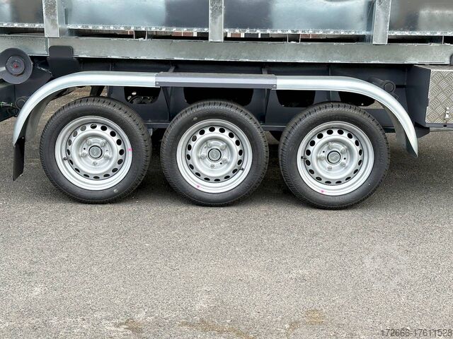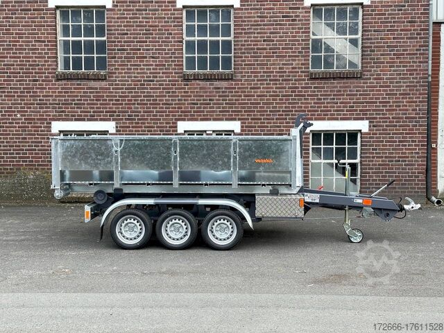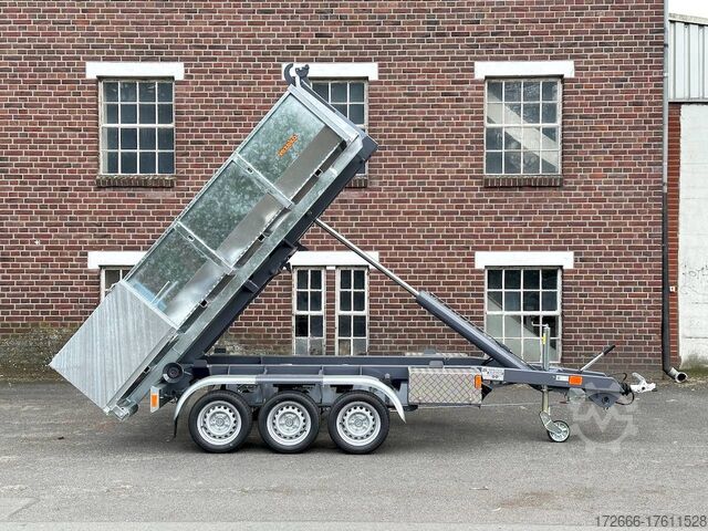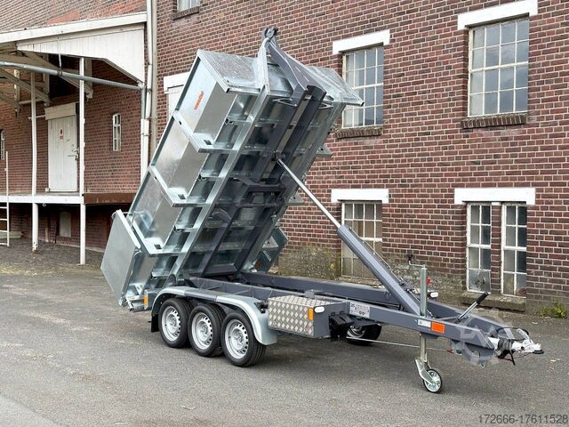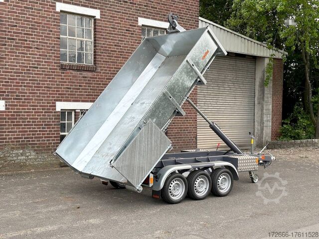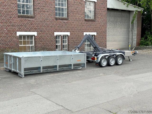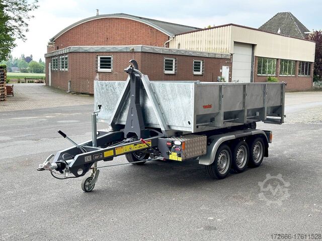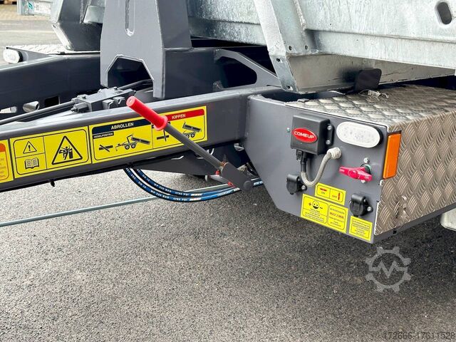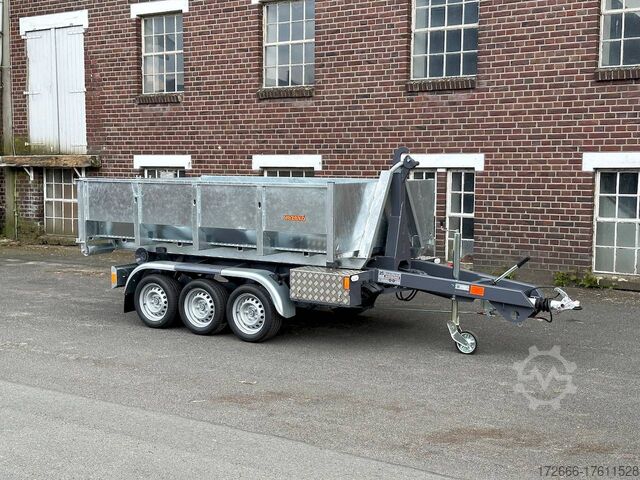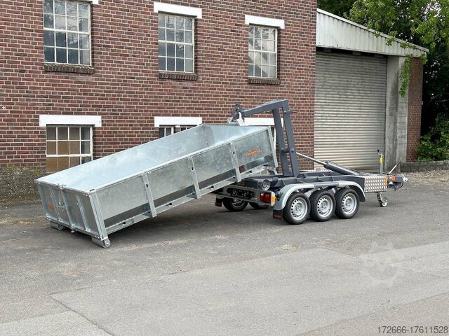 E-hydraulic / radio remote control / 58cm high steel body hot-dip galvanized, automatic reverse, hot-dip galvanized, roof window, * IMMEDIATELY AVAILABLE * incl. E-hydraulic / radio remote control / 58cm high steel body hot-dip galvanized Technical data: - Type: New vehicle - TÜV: New/2 years - Availability: IMMEDIATELY! - Gross vehicle weight: 3,500 kg - Unladen weight: 1,313 kg - Payload: with skip: 2,187 kg - Interior dimensions: 297 x 178 x 58 cm (L x W x H) - Overall exterior dimensions: 397 x 186 x 174 cm (L x W x H) - Tires: 195/50R13C steel rim - Brake: yes - Support wheel: yes, automatic REINFORCED - 100 km/h: at extra charge - incl. Vehicle documents Vehicle superstructure: - Floor: Without / only chassis - Drop sides: Without / only chassis - Drop side height: - - Chassis: Low loader, ALKO rubber spring axle - Tipping function: Hook lift - Hydraulics: Electric with radio remote control - Tipping angle: -- - Steps hydraulic cylinder: 1 step - Overrun device & brake: ALKO - Frame/chassis: Welded steel frame, dark painted - Attachment: Incl. 1x 105cm trough hot-dip galvanized - Lashing eyes: without - Supports: without - Ramps: without - Lighting plug: 13-pin - Approval: COC papers Standard equipment: - Very sturdy welded steel frame - Frame cpl. dark painted - additional longitudinal struts welded in throughout - E-hydraulics for tipping with battery in the box - remote control with radio - hook lift for picking up skips, flatbeds or box bodies - automatic reverse drive - ALKO overrun device and parking brake - rear ramp for tilted function - long lever locks - very sturdy bolted V-drawbar REINFORCED - 13-pin plug - reversing lights - large rear lights - large rear lights - rear lights - rear lights - large rear lights - large rear lights. plug - reversing lights - large safety lighting - integrated rear fog light - lighting recessed in rear frame - automatic center support wheel - registration papers: COC papers INCL. ACCESSORIES: - roll-off skip container 60cm, hot-dip galvanized, INCLUSIVE ALTERNATIVE: - additional roll-off skip container 105cm, hot-dip galvanized at extra charge - roll-off skip container 105cm, hot-dip galvanized at extra charge - roll-off platform with drop sides at extra charge Accessories can be retrofitted - please enquire: - Removable box body - spare wheel - flat tarpaulin - high tarpaulin - net hooks - additional lashing eyes - reversing lights - lashing straps - and much more. New vehicle with warranty and TÜV. We are happy to offer you suitable financing !, Descriptions and pictures are protected by copyright !!! Over 800 trailers immediately available for you! We are for over 30 years Brian James / Humbaur / Hapert / Unsinn / Cheval Liberte / Koch / Debon / Stedele / TPV / Tohaco / Vezeko / Variant / Vlemmix - specialized dealer & repair - workshop - delivery Germany-wide with surcharge possible! Anhänger Zentrum BAUMANN GmbH Dinxperloer Str. 389 46399 Bocholt - Errors, omissions and prior sale excepted -