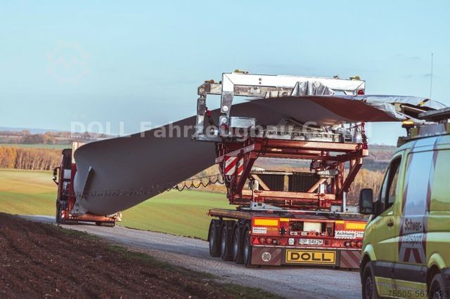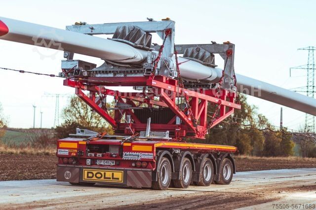 The concept of the self-steering trailer series is specifically designed for the transportation of exceptionally long and heavy loads. DOLL self-steering trailers are robust, track true, and easy to handle, making them ideal for transporting steel or concrete beams and suitable for bridge components or wind turbine parts. Depending on the required payload, DOLL offers three-, four-, and five-axle self-steering trailers, which are each available in combination with a two- or three-axle dolly. Additional steering is available via radio remote control.