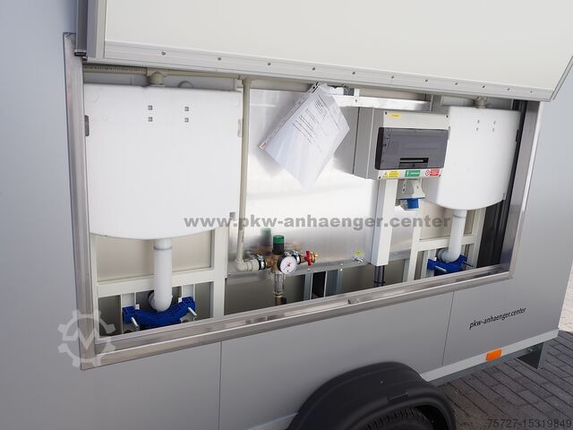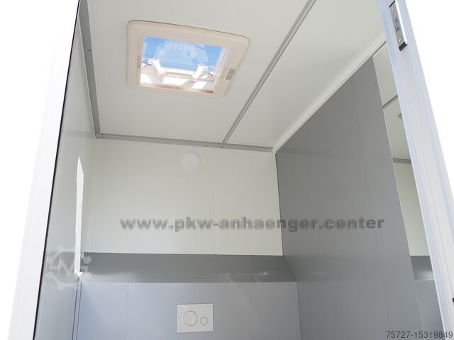 a 50mm insulated sandwich body in silver on the outside, white on the inside, insulated floor, supply flap on the left for the technical equipment, power socket for 230V, distribution box with FI, fresh water access, outlet for drain pipe, four supports, stable frame and a V-drawbar.