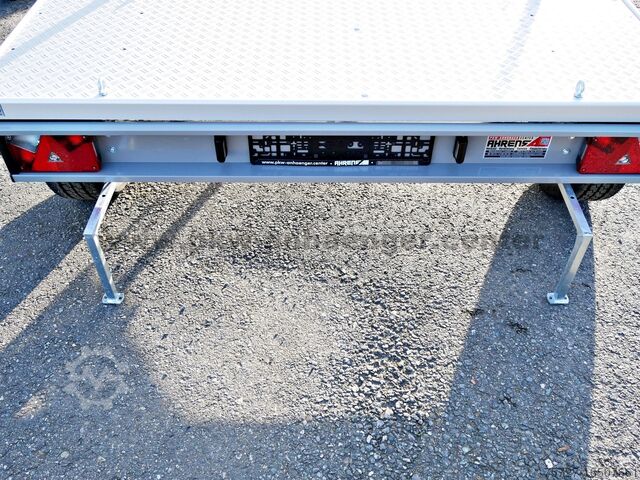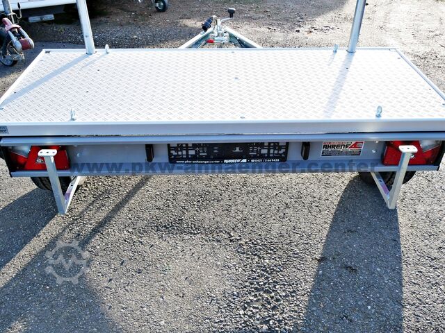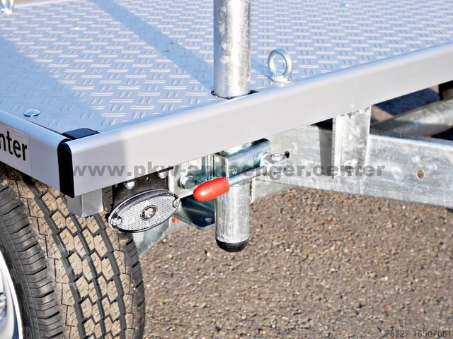 The standard equipment of the motorcycle transporter or bicycle transport trailer includes lashing eyes, aluminium floor, two supports, front grab rail for accessories, support wheel with brake, plug-in lock and safety ball, sturdy hot-dip galvanized frame and a very stable V-drawbar.