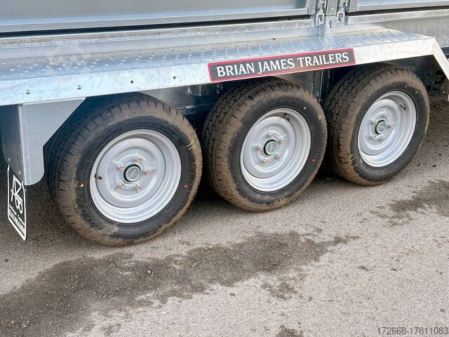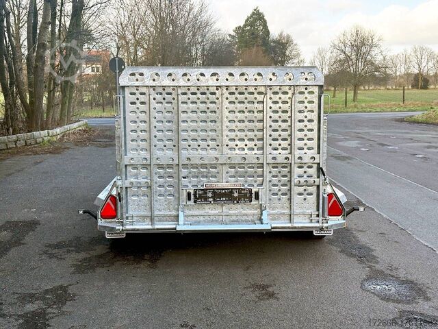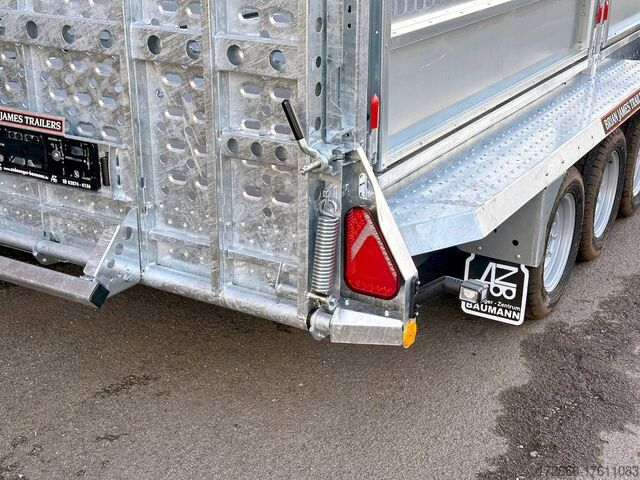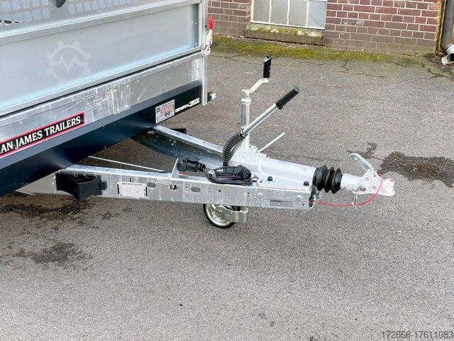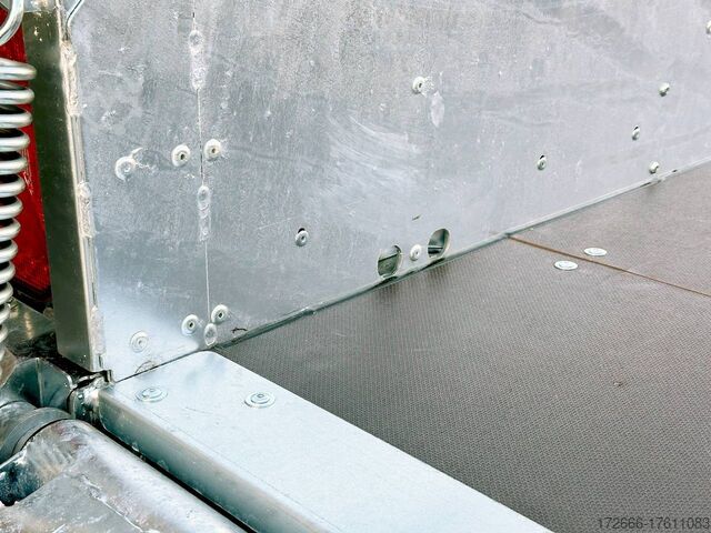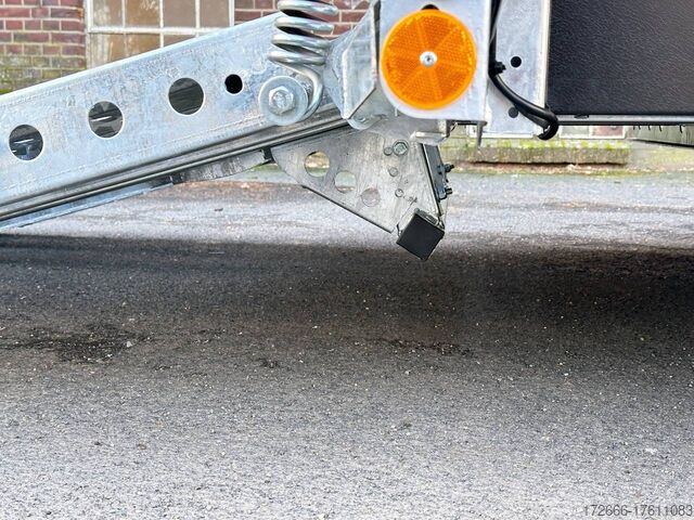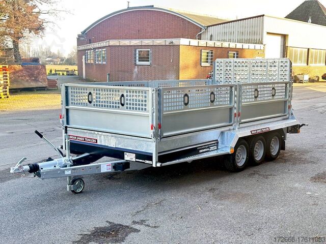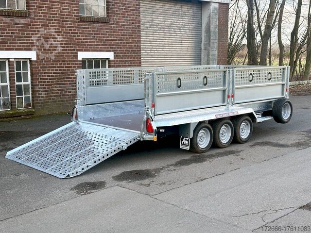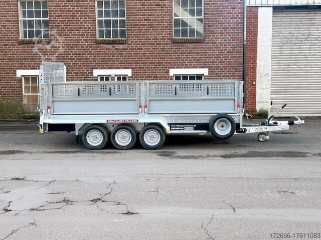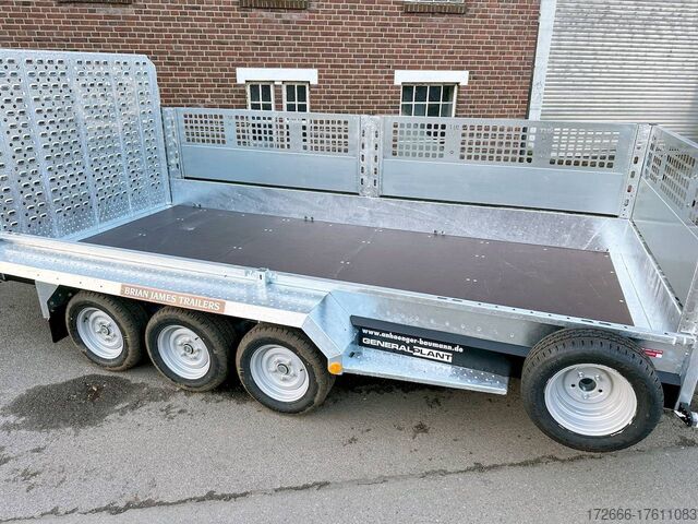 Automatic reverse drive, hot-dip galvanizing, grid attachment / heavy-duty ramp / extremely robust body / multifunctional use / LED lighting / electric wheel, * IMMEDIATELY AVAILABLE * incl. Grid attachment / Heavy-duty ramp / Extremely robust body / Multifunctional use / LED lighting / E-wheel TECHNICAL DATA - Make: Brian James - Model: General Plant - Vehicle type: Construction machinery - Vehicle condition: New vehicle - First registration: Without first registration - TÜV/HU: 2 years from first registration - Internal dimensions (LxWxH): 400 x 180 x 96 cm - External dimensions (LxWxH): 569 x 240 x 210 cm - Loading height of floor: 48 cm - Perm. Total weight: 3,500 kg - Empty weight: 1.025 kg - Payload: 2.475 kg - Chassis: Low loader (wheels next to the body) - Tyres: 195/60R12C - Chassis: ALKO rubber spring axle - Support wheel: Yes - 100 km/h approval: Optional, can be retrofitted DESCRIPTION - Universal all-rounder construction machinery trailer - Unique on the market - Every available option can be flexibly attached or removed and thus enables customization for almost any area of application - Insertion option at all 4 corners for drop sides, tarpaulin frames, side wall extensions or front wall extension - Steel side wall extension - 50% lattice extension + 50% closed side wall, can be removed without tools - Incl. recessed eccentric locks - hard-wearing rubber strip seals the attachment to the dropside at the bottom - vehicle also intended for all options after purchase: enormous potential for retrofitting: hydraulic tipping functions, winches, other ramps, attachments, etc. can be retrofitted at any time - robust steel mudguards with non-slip perforated profile - reinforced 18 mm screen-printed wooden floor, non-slip and waterproof - very sturdy welded steel frame - frame completely hot-dip galvanized - chassis with additional longitudinal beam underneath the loading area - sturdy, sturdy chassis with additional longitudinal beam underneath the loading area - sturdy chassis with additional longitudinal beam underneath the loading area - sturdy chassis with additional longitudinal beam underneath the loading area - sturdy chassis with additional longitudinal beam underneath the loading area.stable ACME locking system: closes silently, loading ramps are held in place by safety clamp locks, rubber buffer dampens noise - heavy-duty perforated steel ramp, galvanized steel, with spring support (heavy-duty) - very low chassis for low drive-on angle - lashing points at the bottom and top of the dropside (1000dAN/kg) TÜV certified - side panels color: black - maintenance-free axles and damping systems designed for long journeys and heavy loads - spare wheel mounted on the dropside for easy access - automatic reverse drive - ALKO overrun hitch and parking brake - cast steel coupling head with integrated ALKO high-security lock - very stable V-drawbar REINFORCED - 13-pin plug - complete LED lighting system - complete LED lighting system - very stable V-drawbar REINFORCED - 13-pin plug - complete LED lighting system. Plug - Complete LED lighting: Extremely bright, durable and reliable. - LED rear lane departure lights - Reversing lights - Integrated rear fog light - Robust rear light protection - Automatic heavy-duty support wheel - 5-year chassis warranty Accessories can be retrofitted - please enquire! - Excavator bucket support - Tipping hydraulics - Lashing straps - Storage box - Winch - and much more New vehicle with warranty and TÜV.