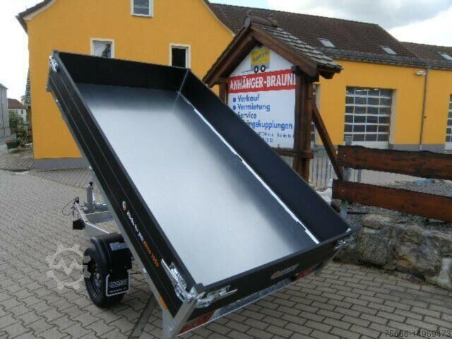 New series of rear tippers! Braked rear tipper, single-axle high-loader with aluminum side walls that can be folded down and removed on all sides, wooden floor covered with sheet steel, lashing brackets on the side in a V-groove in the floor plate, very sturdy hot-dip galvanized and welded steel frame, hydraulic manual control, 13-pin electrical system, automatic support wheel.