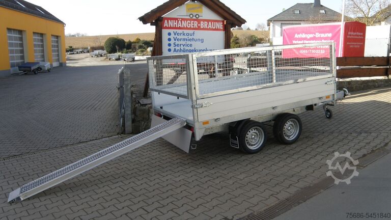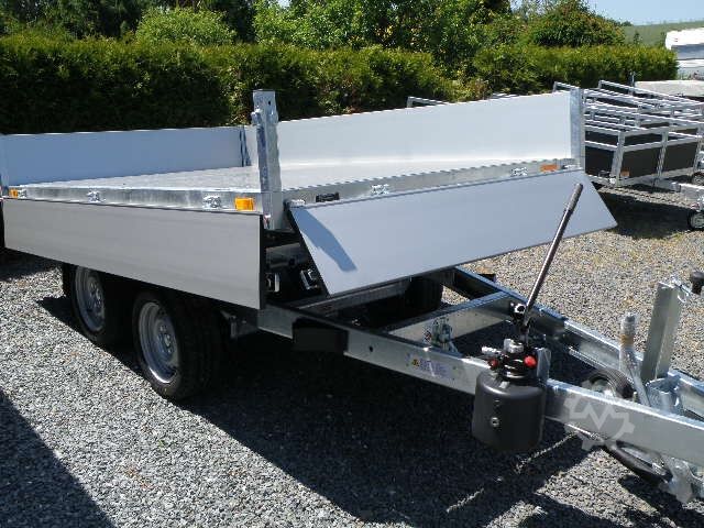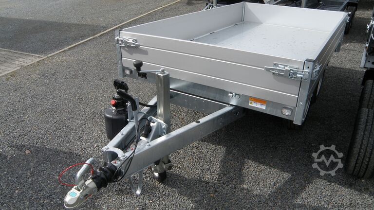 New series rear tipper ! Two-axle, braked rear tipper high loader, with aluminum drop sides foldable and removable on all sides, wooden floor covered with sheet steel, welded, hot-dip galvanized steel frame, with hydraul. Hand pump, automatic support wheel, 6 lashing brackets in a V-groove on the side as standard