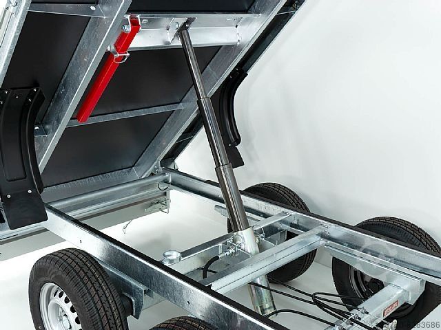 The loading area can be tilted backwards using an electric pump. An overrun brake prevents the towing vehicle from being pushed by the load when stopping or on slopes. All load-bearing steel frame parts are hot-dip galvanized.