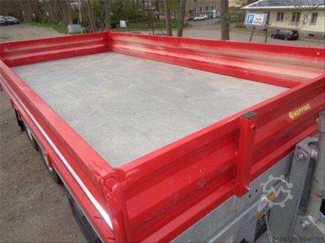 Sturdy tipping body with 4 mm sheet steel floor, steel side wall construction, continuous side walls, foldable and pivoting with central locking at the bottom. Rear corner stanchions are pluggable. The rear wall is foldable and pivots, with central locking at the bottom.