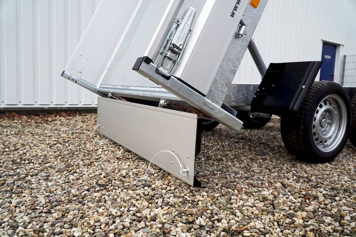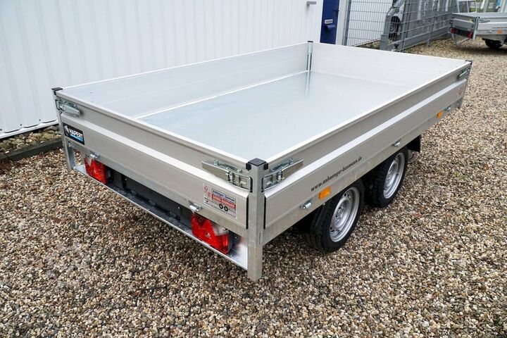 Hydraulics, automatic reverse drive, hot-dip galvanizing, roof window, * IMMEDIATELY AVAILABLE * Technical data: - Type: New vehicle with 2 years TÜV from first registration - Availability: Immediately available!!! - TÜV: 2 years - Floor: Multiplex screen printing covered with sheet steel - Gross vehicle weight: 2,700 kg - Unladen weight: 647 kg - Load capacity: 2,053 kg - Interior dimensions: 280 x 160 x 30 cm (L x W x H) - Overall exterior dimensions: 420 x 166 x 96 cm (L x W x H) - Loading sill height: 66 cm - Tires: 195/50R13 steel rim - Brake: yes - Support wheel: yes, automatic - Incl. vehicle documents (letter) - 100 % warranty. Vehicle documents (letter) - 100 km/h: at extra charge DESCRIPTION: - New dropside hinges incl. welded-on hooks for attaching a cargo net, among other things. - Aluminium drop sides with robust built-in locks - Anodized double-walled aluminium drop sides - All drop sides foldable and removable - Removable steel corner stanchions - Insertion option at all 4 corners for tarpaulin frames, grid attachment, drop side attachments or front wall extension - Cargo net hooks on lower hinge parts - Sturdy eccentric locks - Galvanized sheet steel on multiplex floor plate - Reinforced sturdy bolted V-drawbar - Very sturdy welded steel frame - Frame compl. hot-dip galvanized - many cross beams therefore high point load - additional longitudinal struts welded in throughout - all cross and longitudinal beams rest on the floor - 6 lashing brackets recessed inside the side edge (1000DaN/kg) TÜV certified! - U-profile at the rear for easier attachment of the loading ramps - Loading ramp shaft prepared - Solid 4-stage hydraulic cylinder - Electric hydraulic pump with battery (12V/90AH) in the box incl. cover - Detachable remote control for e-hydraulics with spiral cable and battery status display - External battery charging socket for optional 230V charger - Maintenance-free rubber spring axles from ALKO/BPW - Automatic reverse driveALKO/BPW overrun device and parking brake - 13-pin plug - reversing lights - large-dimensioned safety lighting - integrated rear fog light - lighting recessed in rear frame - automatic central support wheel Accessories optionally available: - High front grille, 50 cm - Tarpaulin + bows in various heights supports, grids, side wall attachments, nets etc. New vehicle with warranty and TÜV. We are happy to offer you suitable financing !, Descriptions and pictures are protected by copyright !!! Over 800 trailers immediately available for you! We are for over 30 years Brian James / Humbaur / Hapert / Unsinn / Cheval Liberte / Koch / Debon / Stedele / TPV / Tohaco / Vezeko / Variant / Vlemmix - specialized dealer & repair - workshop - delivery Germany-wide with surcharge possible! Anhänger Zentrum BAUMANN GmbH Dinxperloer Str. 389 46399 Bocholt - Errors, omissions and prior sale excepted -