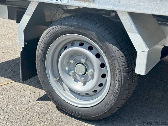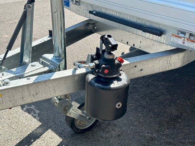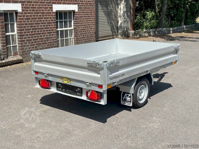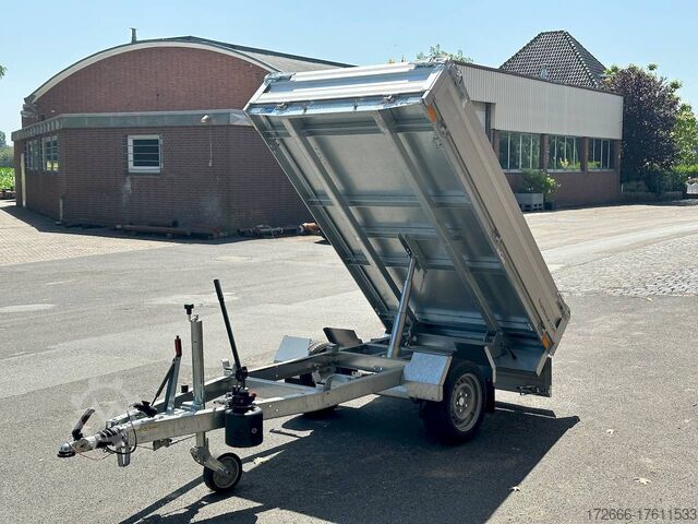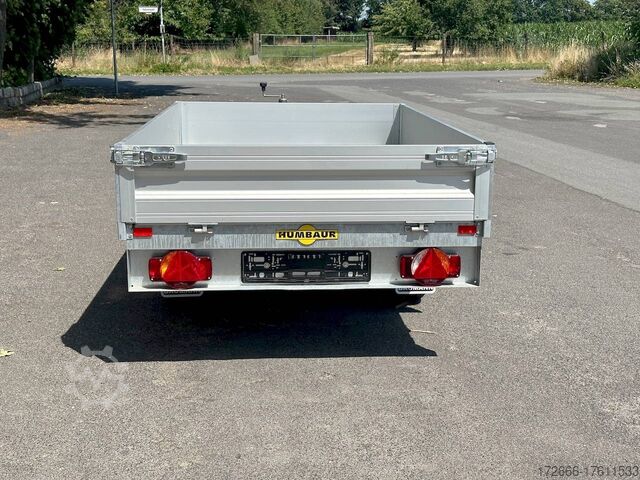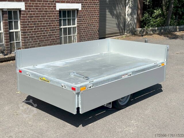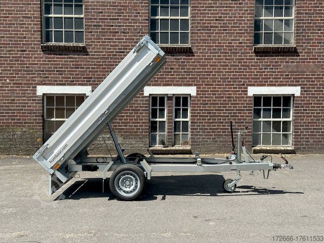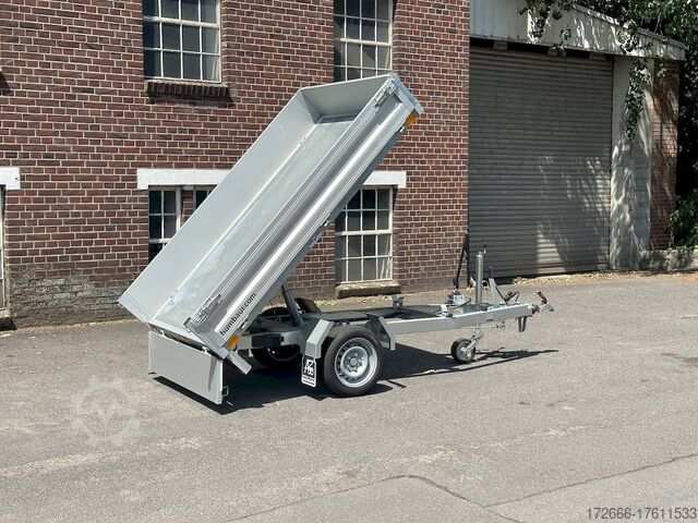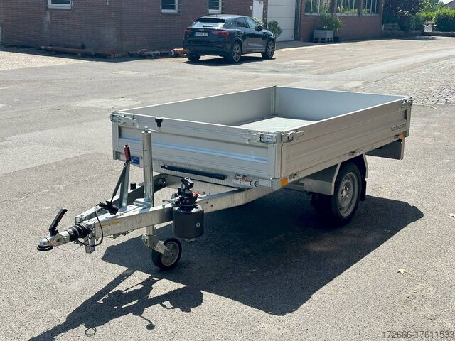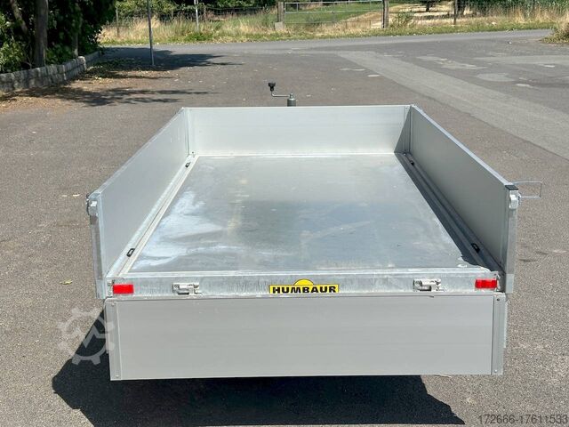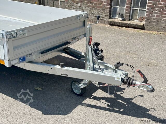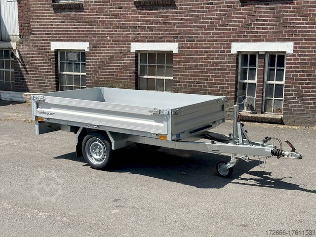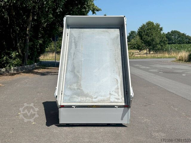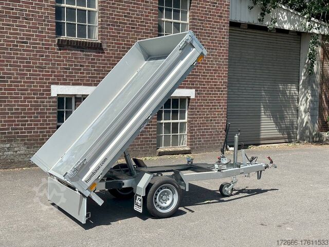 Hydraulics, automatic reverse drive, hot-dip galvanizing, roof window, hand pump / full steel floor, * IMMEDIATELY AVAILABLE * incl. hand pump / full steel floor Technical data: - Type: New vehicle - TÜV: New/2 years - Availability: IMMEDIATELY! - Gross vehicle weight: 1,500 kg - Unladen weight: 400 kg - Payload: 1,100 kg - Interior dimensions: 230 x 140 x 30 cm (L x W x H) - Overall exterior dimensions: 365 x 154 x 95 cm (L x W x H) - Loading sill height: approx. 64 cm - Tires: 195/50R13C steel rim - Brakes: yes - Support wheel: yes, automatic - 100 km/h: at extra charge - Incl. vehicle documents: yes Vehicle superstructure: - Floor: solid steel floor, solidly reinforced - Side walls: anodized aluminium double-walled, 4x folding & removable - Side wall height: 30cm - Chassis: high loader, ALKO rubber spring axle - Tipping function: yes, backwards - Hydraulics: hand pump tipping - Tipping angle: approx. 45 - Steps hydraulic cylinder: 3 steps - Overrun device & brake: ALKO - Frame/chassis: welded hot-dip galvanized steel frame - Attachment: at extra charge - Lashing eyes: 4 pieces in the floor (800kg/daN) - Supports: at extra charge - Ramps: at extra charge Standard equipment: - Anodized double-walled aluminium drop sides - Drop sides can be folded to the side and rear - Removable drop sides - Full steel floor - Extremely robust - Very sturdy welded steel frame - Frame completely hot-dip galvanized - Many options available hot-dip galvanized - many sturdy cross beams for high point loading - additional longitudinal struts welded in throughout - hand pump for manual tipping - lashing hooks welded to the bottom of the frame - automatic reverse drive - ALKO overrun device and parking brake - sturdy tension locks - very sturdy V-drawbar REINFORCED - 13-pin plug - reversing lights - large reversing light - large rear lights - large rear lights - large rear lights. plug - reversing lights - large safety lighting - integrated rear fog light - lighting recessed in rear frame - automatic center support wheel - registration papers: ZBII and COC papers Accessories can be retrofitted - please enquire: - 100km/h approval with shock absorbers - hydraulic pump for cordless screwdriver operation - side wall attachment - corrugated grid attachment 60cm - closed sheet metal attachment 60cm - spare wheel - storage box - rear supports - ramps - flat tarpaulin - net hooks - additional lashing eyes - slotted-hole rails for tension belts & locking beams - bar strip with rubber coating for tension belts & locking beams - reversing lights - lashing straps - and much more. New vehicle with warranty and TÜV. We are happy to offer you suitable financing !, Descriptions and pictures are protected by copyright !!! Over 800 trailers immediately available for you! We are for over 30 years Brian James / Humbaur / Hapert / Unsinn / Cheval Liberte / Koch / Debon / Stedele / TPV / Tohaco / Vezeko / Variant / Vlemmix - specialized dealer & repair - workshop - delivery Germany-wide with surcharge possible! Anhänger Zentrum BAUMANN GmbH Dinxperloer Str. 389 46399 Bocholt - Errors, omissions and prior sale excepted -