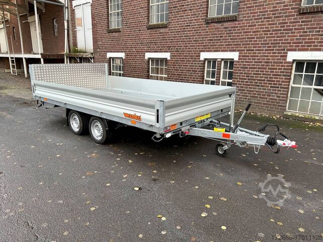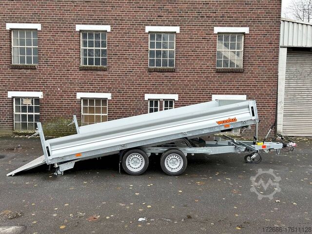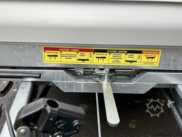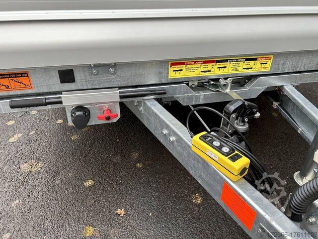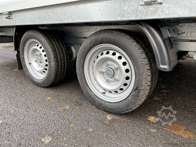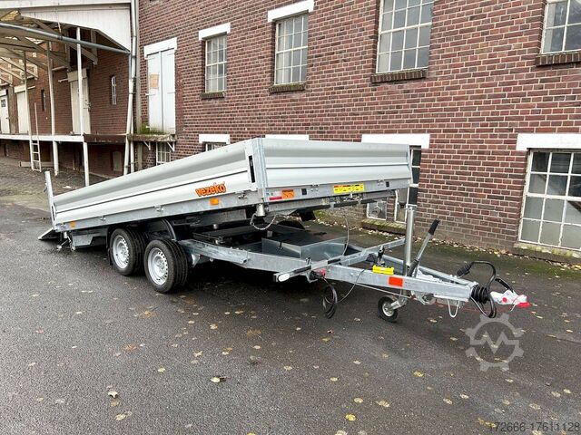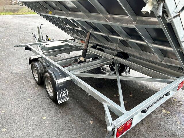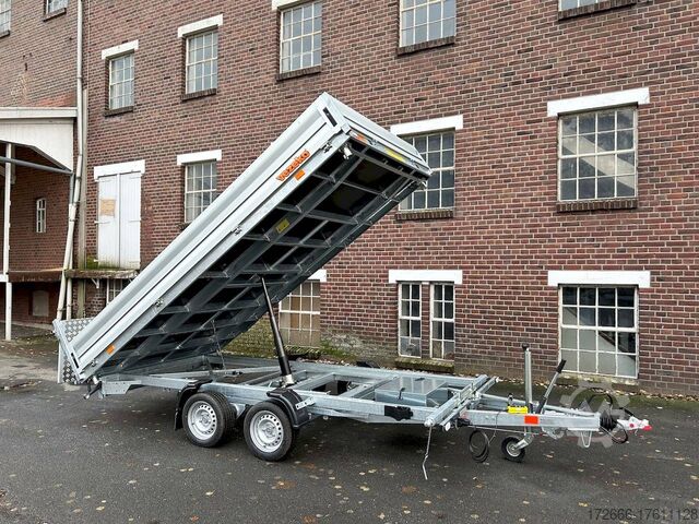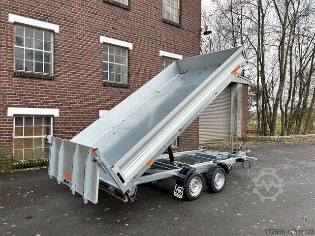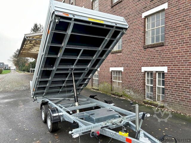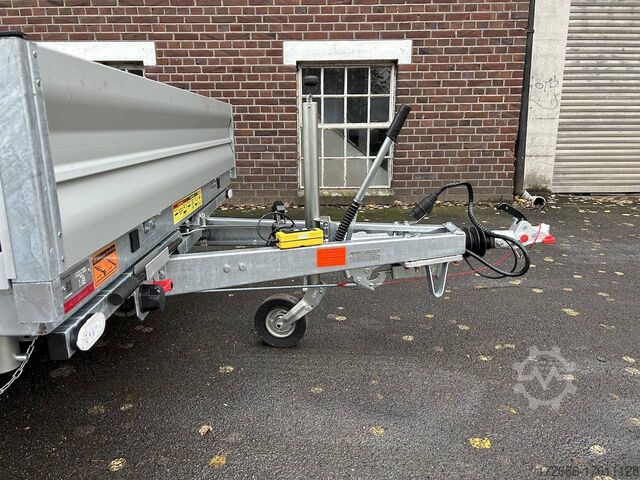 E-hydraulics / emergency hand pump / three-way tipper / tiltable loading area, automatic reversing, drive-on ramp, tiltable loading area, hot-dip galvanized, * IMMEDIATELY AVAILABLE * incl. E-hydraulics / emergency hand pump / three-way tipper / tiltable loading area Technical data: - Type: New vehicle - TÜV: New/2 years - Availability: IMMEDIATELY! - Gross vehicle weight: 3,500 kg - Unladen weight: 1,140 kg - Payload: 2,360 kg - Interior dimensions: 400 x 210 x 35 cm (L x W x H) - Overall exterior dimensions: 545 x 215 x 136 cm (LxWxH) - Loading sill height: 63 cm - Tires: 195/50R13C steel rim - Brake: yes - Support wheel: yes, automatic REINFORCED - 100 km/h: at extra charge - incl. Vehicle documents Vehicle superstructure: - Floor: Galvanized steel plate on Finnish wooden multiplex plate - Side walls: Anodized aluminium double-walled, 3x foldable & removable - Side wall height: 35cm - Chassis: High loader, ALKO rubber spring axle - Tipping function: Yes, three-sided + tiltable - Hydraulics: Electric & emergency hand pump tipping - Tipping angle: approx. 45 - Steps hydraulic cylinder: 5 steps - Overrun device & brake: ALKO - Frame/chassis: welded hot-dip galvanized steel frame - Attachment: at extra charge - Lashing eyes: 8 pieces in the floor (750kg/daN) - Supports: without - Ramps: drive-on flap can also be used as pendulum flap, approx. 1000kg loadable, covered with aluminium chequer plate - Lighting plug: 13-pin - Approval: COC papers Standard equipment: - Anodized aluminium drop sides, double-walled - Drop sides can be folded to the side and rear - Drop sides removable - Lifting flap can also be swivelled + drive-on 1000kg loadable - Galvanized steel plate on Finnish wooden multiplex plate - Very sturdy welded steel frame - Frame completely hot-dip galvanized - Many options available - Many options available. hot-dip galvanized - many stable cross beams therefore high point load - additional longitudinal struts continuously welded - E-hydraulics for tilting with battery in the box and cover - cable remote control removable with magnet - external battery charging socket for 230V charger - emergency hand pump, for manual tipping when the battery is empty - automatic reverse drive - ALKO overrun device and parking brake - rear ramp for tilted function - long lever locks - very sturdy bolted V-drawbar REINFORCED - 13-pin plug - reversing lights - large reversing lights plug - reversing lights - large-dimensioned safety lighting - integrated rear fog light - lighting recessed in rear frame - automatic center support wheel, reinforced version from ALKO - registration papers: COC papers Special equipment included in the price: - Sheet steel mounted on multiplex floor Accessories can be retrofitted - please enquire: - 100km/h approval with shock absorbers - 100cm corrugated grid attachment - spare wheel - storage box - battery - 230V charger - flat tarpaulin - high tarpaulin - net hooks - additional lashing eyes - slotted-hole rails for tension belts & locking beams - bar strip with rubber coating for tension belts & locking beams - reversing lights - lashing straps - and much more. New vehicle with warranty and TÜV. We are happy to offer you suitable financing !, Descriptions and pictures are protected by copyright !!! Over 800 trailers immediately available for you! We are for over 30 years Brian James / Humbaur / Hapert / Unsinn / Cheval Liberte / Koch / Debon / Stedele / TPV / Tohaco / Vezeko / Variant / Vlemmix - specialized dealer