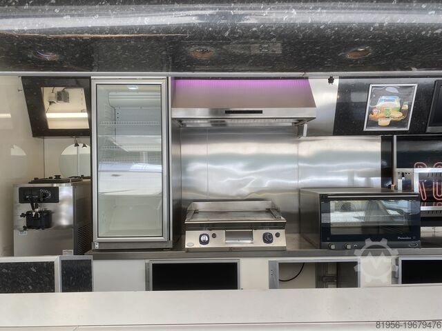 Оснащение: жарочная линия Hewigo (B22) с 4 фритюрницами, водоохлаждаемая аппарат для мягкого мороженого Taylor, хромированная жарочная поверхность Electrolux (E7FTGHCS00), выдвижная охлаждаемая витрина, холодильная камера, печь Unox, вытяжка, тепловой мост, бен-мари, моечная раковина, дистанционное управление для перемещения автомобиля, электрически управляемый экран, инфракрасный обогрев (2 шт.) и прочее оборудование согласно фото.