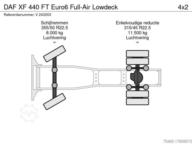 Rear axle: Tire size: 315/45 R22.5; Twin tyres; Max. axle load: 11,500 kg; Reduction: single reduction