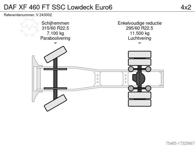 Rear axle: Tire size: 295/60 R22.5; Twin tires; Max. axle load: 11,500 kg; Reduction: single reduction; Suspension: air suspension