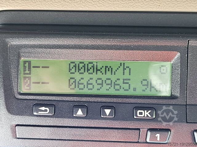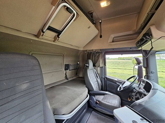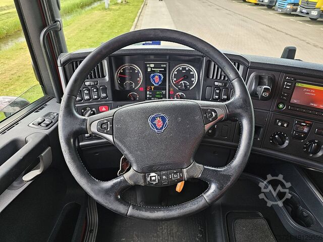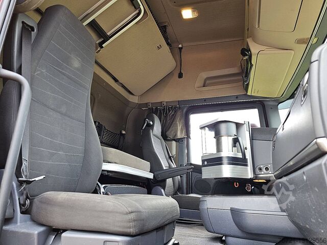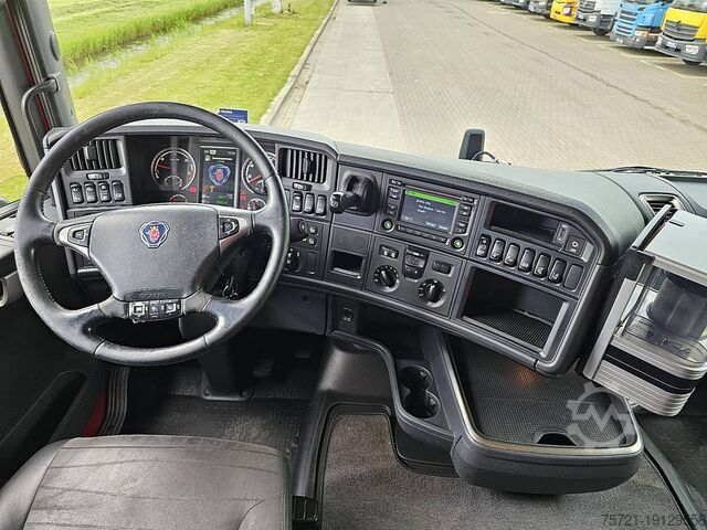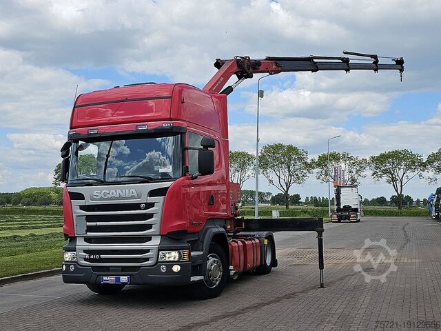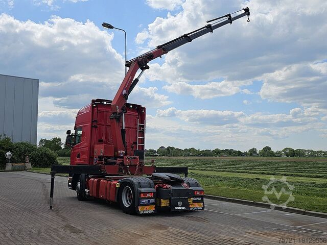 Number of axles: 2, Configuration: 4x2, Unladen weight: 8,490 kg, Gross weight: 19,500 kg, Total fuel tank capacity: 950 liters, Fifth wheel height: 114 cm, Fifth wheel: slider, Number of differential locks: 1, Suspension type: air suspension, Cabin type: Topline, Cruise control, Recording device (control unit), Digital tachograph, Air conditioning, Auxiliary heating, Color: red, Engine power: 301 kW (404 hp), Emission standard: Euro 6, Transmission type: Opti-cruise, Gears: 12, Auxiliary brake system, Retarder brand: Scania, Power steering, ABS, ASR, PTO (Power Take-Off), PTO type: 1, Pump, Crane, Crane manufacturer: HMF 1720 K4, Year of crane: 2012, Crane capacity: 17, Maximum load: 1,000 kg at 12.7 m., Number of support legs: 2, CE certified, Control position: left side operation, Remote control, Crane position: behind the cab, extendable: 4x, extendable: 2x, Hydraulic auxiliary connection: none, Lifting hook, R 410 LA 4X2 HNA / GRS905 RETARDER / HMF 1720-K4 YEAR 2012