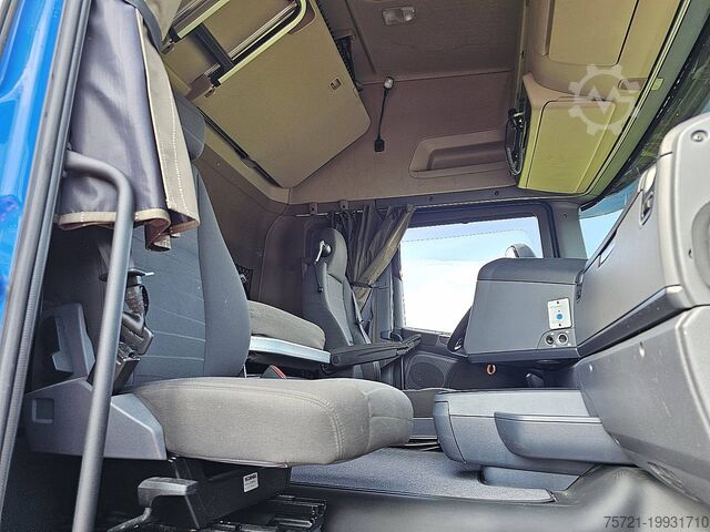 Number of axles: 2, Configuration: 4x2, Payload: 10,911 kg, Curb weight: 8,089 kg, Gross weight: 19,000 kg, Total tank capacity: 1,000 liters, Unbraked trailer load: 750 kg, Fifth wheel height: 110 cm, Fifth wheel: Fixed, Number of locks: 1, Suspension type: Air suspension, Cab type: Highline, Cruise control, Tachograph (control device), Digital tachograph, Air conditioning, Stationary air conditioning, Auxiliary heater, Electric windows, Electric mirrors, Radio/Cassette, GPS navigation, Colour: Blue, Heated mirrors, Lighting type: Halogen lamp, Speed limiter, Lane assist, Climate control, Heated seats, Bluetooth, Engine power: 331 kW (444 HP), Fuel: Diesel, Emissions standard: Euro 6, Transmission variant: Opti-cruise, Gearbox: Scania, Speed limiter, Gears: 12, Additional braking system, Retarder brand: Scania, Power steering, ABS, ASR, Starter battery, Central locking, Seats: 2, Seating arrangement: 1+1, Upholstery: Fabric, Seat adjustment: Manual