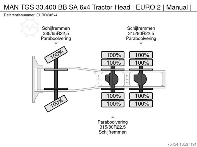 Rear axle 2: Tire size: 315/80R22.5; Double tires; Tire profile left inside: 100%; Tire profile left outside: 100%; Tire profile right inside: 100%; Tire profile right outside: 100%