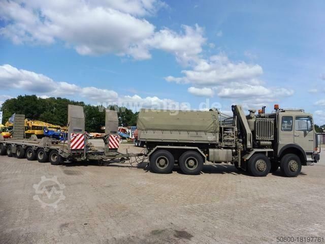 Тяжелый полноприводный тягач 8x8 для тяжелых грузов прицепов, ремонтно-эвакуационных работ и т. д., гидротрансформатор WSK, нагрузка на задний прицеп 100 000 кг, переднее сцепное устройство для толкания, 2 эвакуационные лебедки Rotzler по 200 кН каждая (40 000 кг). Длина троса ок. 50 м, 1 лебедка самовытаскивания Rotzler с тросом 80 кН (8000 кг), длина ок. 55 м, 1 вспомогательная лебедка Rotzler для вытягивания двух тросов подъемной лебедки 6 кН (600 кг), длина троса ок. 100 м, 1 х кран-манипулятор Palfinger PK 8200A на 2,5 м = 3150 кг, на 7,7 м = 970 кг, грузовая площадь ок. 3650 мм, высота боковой стенки ок. 680 мм, место для балласта и Горное снаряжение, вес стали и балласта ок. 13 000 кг, преодолеваемый подъем при 20% ок. 110 000 кг, бак ок. 400 + 210 литров, двигатель 10-цилиндровый с турбонаддувом, проходимость 800 мм, отличное состояние, автомобиль можно покрыть рекламой. и/или иметь маркировку.