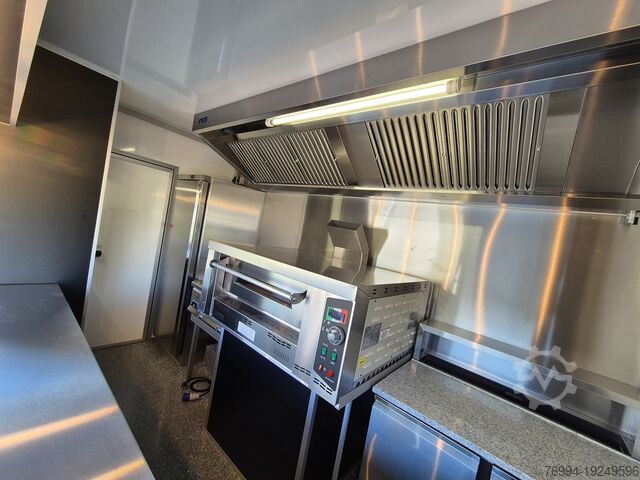Deep fryer, pizza oven, preparation station with top cooling and bottom cooling.