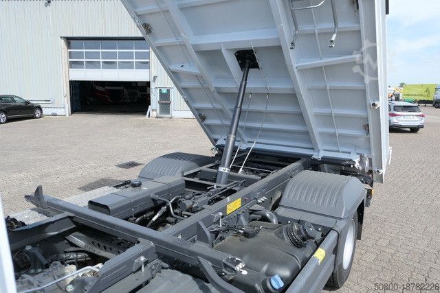 Трехсторонний кузов Meiller, приподнятая передняя стенка примерно на 400 мм, 4 пары крепежных проушин, утопленных в пол, шаровая головка и кулачковое сцепное устройство, электронная тормозная система с ABS и ASR, система помощи при движении на подъеме, моторный тормоз, блокировка заднего дифференциала, система помощи при трогании на подъеме, круиз-контроль, FleetBoard / предварительная установка, кнопка запуска и остановки двигателя, многофункциональное рулевое колесо, датчик дождя, датчик освещенности, кондиционер, стандартное сиденье водителя с подвеской, наружные зеркала заднего вида с подогревом и электроприводом. регулируемый, электрический Стеклоподъемники на водительской и пассажирской дверях, люк на крыше, центральный замок с дистанционным управлением, заднее стекло, автоматические дневные ходовые огни, рессорная подвеска, транспортное средство может быть покрыто рекламой и/или надписями