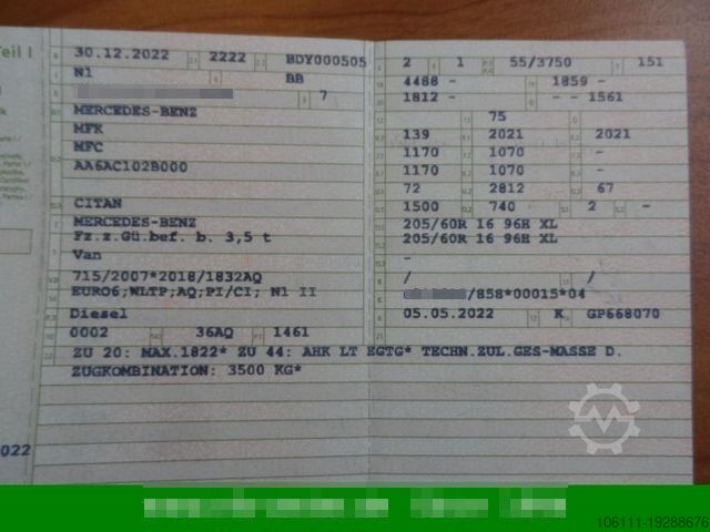 Driver/passenger airbag, traction control (ASR), electrically adjustable and heated exterior mirrors, both, standard design and equipment line, driver assistance system: attention assist (drowsiness detection sensor), driver assistance system: hill start assist, rear wing doors without glazing (opening angle 180 degrees), Infotainment system: Mercedes me connect, body/superstructure: van, instrument cluster with matrix display, communication module (LTE) preparation Mercedes me connect, head airbag system (window bag), cargo compartment partition, steering column (steering wheel) mechanically adjustable, Mercedes-Benz emergency call system, engine 1.5 l - 55 kW CDI CAT, radio reception digital (DAB) preparation, wheelbase 2716 mm, low-emission according to Euro 6d emission standard, H4 headlights, sliding door load/passenger compartment right, front side airbag, driver’s seat height adjustable, preparation for remote service plus, heat-insulating glazing.