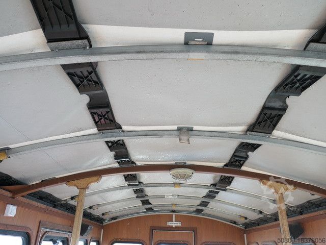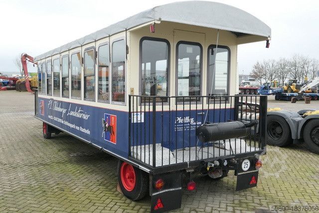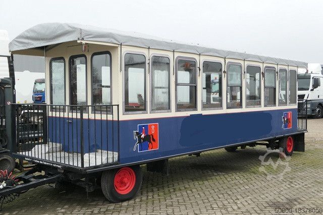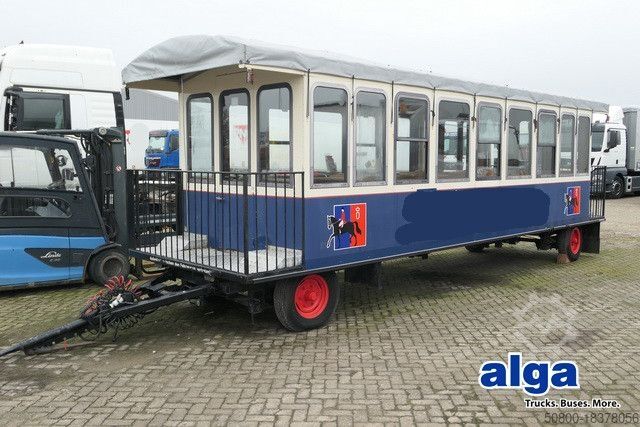 Закрытый пассажирский прицеп с полным остеклением и раздвижными окнами, сдвижная крыша, 3 двери справа, двери спереди и сзади, сиденья: 32, отопление, внутренние стены обшиты деревом, динамики, внутреннее освещение, ось BPW, 2 x управляемая(ые) ось, барабанная тормозная система, пневматическая подвеска, регулируемая длина дышла, кольцевая пружина сцепного устройства, автомобиль может быть накрыт и/или промаркирован рекламой