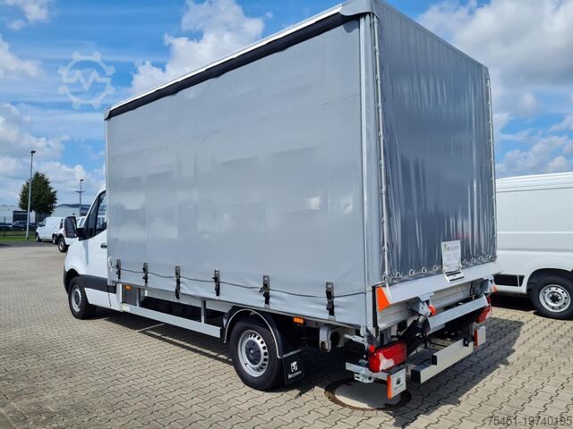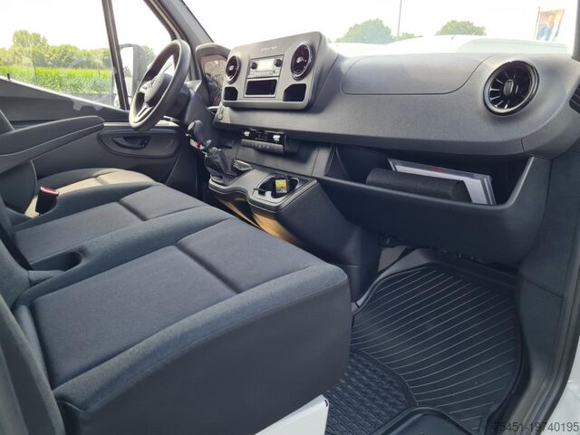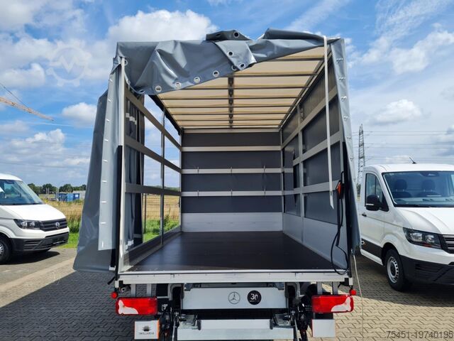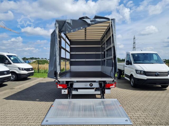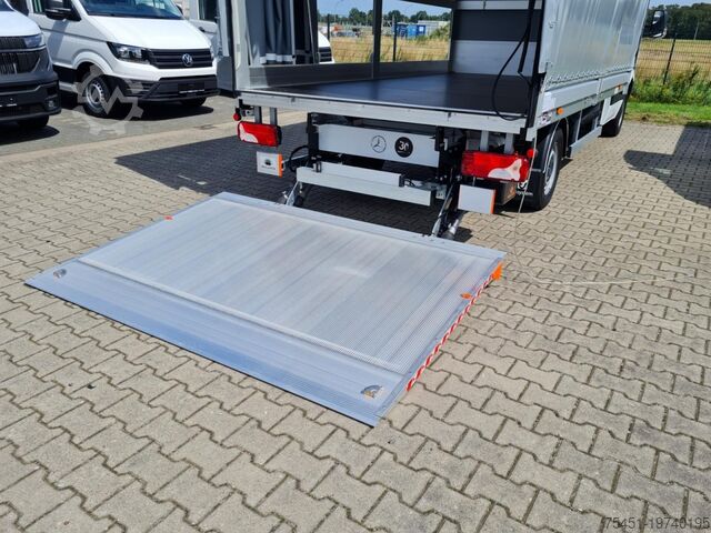 Tail lift DHOLLANDIA up to 750 kg, tarpaulin, wind deflector, right-side toolbox, regulated air conditioning (Tempmatik), keyless start, electrically adjustable and heated exterior mirrors (both sides), electric windows (2), cruise control, multifunction steering wheel, external storage compartment, spare wheel with road tires, summer tires, light sensor, rain sensor, daytime running lights, DAB tuner (digital radio reception), radio with USB and Bluetooth hands-free system, Mercedes-Benz emergency call system, long wheelbase, heat-insulating glazing, storage package, tachometer, driver's airbag, anti-lock braking system (ABS), electronic stability program (ESP), comfort seats, center armrest, engine start/stop system, particulate filter, full service history, immobilizer, headlight range adjustment, marker lights, outside temperature display, power steering, paint: ARCTIC WHITE, left-side sliding tarpaulin, extended mirror arms left/right, communication module (LTE) for digital services, fuel filter with water separator, single-pole battery isolator, terminal strip for electrical connections (under driver's seat), driver comfort seat with armrest, passenger double seat, front cup holders, main fuel tank: 93 liters, jack, spare wheel holder under rear frame including jack, instrument cluster with color display, seat belt system with warning indicator (passenger side), truck registration, permitted gross vehicle weight 3.50 t, exterior noise measures, automatic headlight activation, adaptive brake lights, side marker lights, service interval indicator (Assyst), washer fluid level display, storage compartment below passenger dashboard, roof lining in driver's cab, seat belt system with warning indicator (driver's side), overhead storage compartment above front windshield, electronic brakeforce distribution (EBD), brake assist, chassis: stabilization level I, steering column (mechanically adjustable), traction control system (ASR), crosswind assist, fleece battery 92 Ah, alternator 200 A, body/construction: flatbed (standard), wheelbase 4325 mm, drive type: rear-wheel drive, 6-speed manual transmission - TSG (Eco Gear).