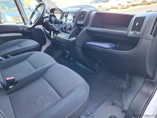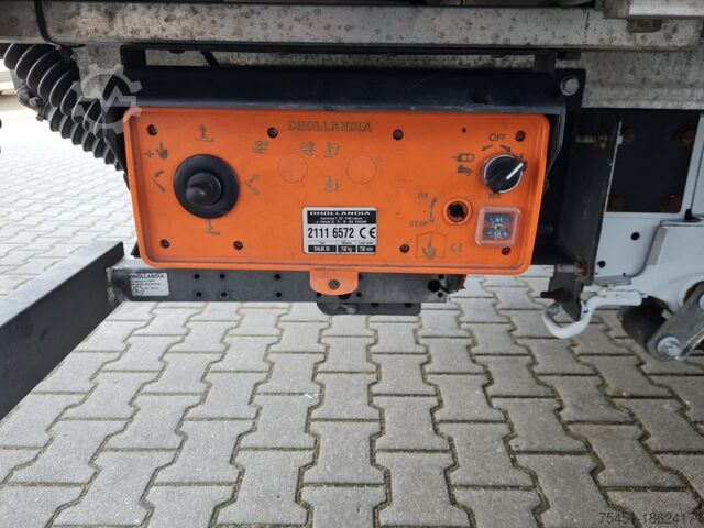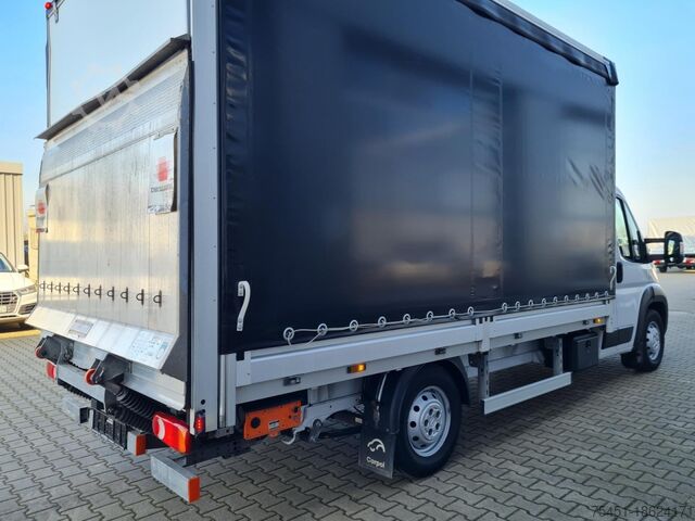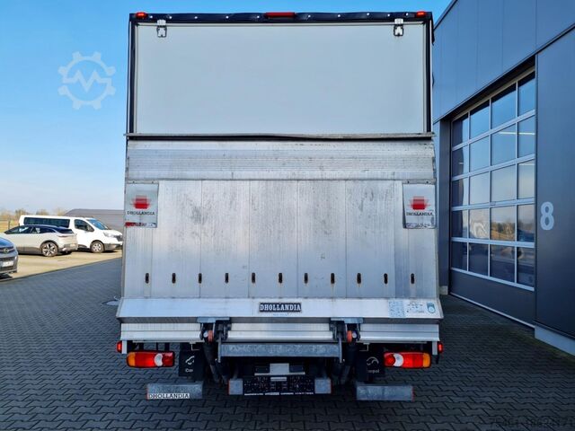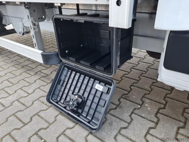 Dhollandia tail lift up to 750 kg, high tarpaulin, wind deflector, air conditioning, central locking with selective remote control, electrically adjustable and heated exterior mirrors, electric front windows, cruise control, external storage compartment, spare wheel with matching tire, winter tires, daytime running lights, DAB tuner (digital radio reception), radio with Bluetooth hands-free kit, USB interface, rear axle air suspension, thermal insulation glazing, storage package, tachometer, driver’s airbag, anti-lock braking system (ABS), traction control, comfort seats, center armrest, driver’s comfort seat with armrest and lumbar support, gear shift paddles on the steering wheel, start/stop system, electronic immobilizer, headlight range adjustment, clearance lights, outside temperature display, power steering, sliding tarpaulin on right side, storage box on right side, overhead storage above windshield, quickheat electric heater, interior pollen filter, permissible total weight 3.5 t, adjustable steering column (steering wheel), crosswind assist, 185 A alternator, bodywork/type: flatbed with tarpaulin, wheelbase: 4,035 mm, drive type: front-wheel drive, 6-speed gearbox.