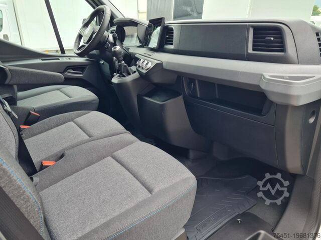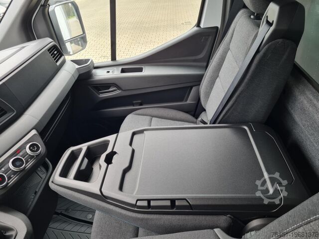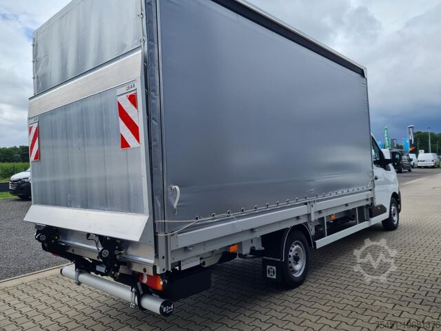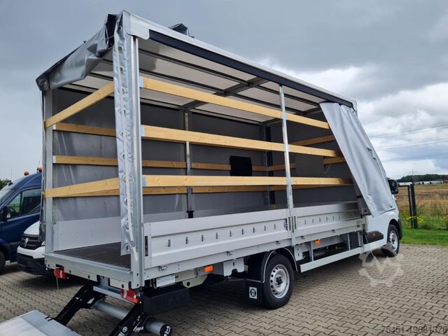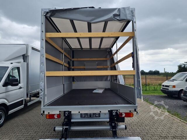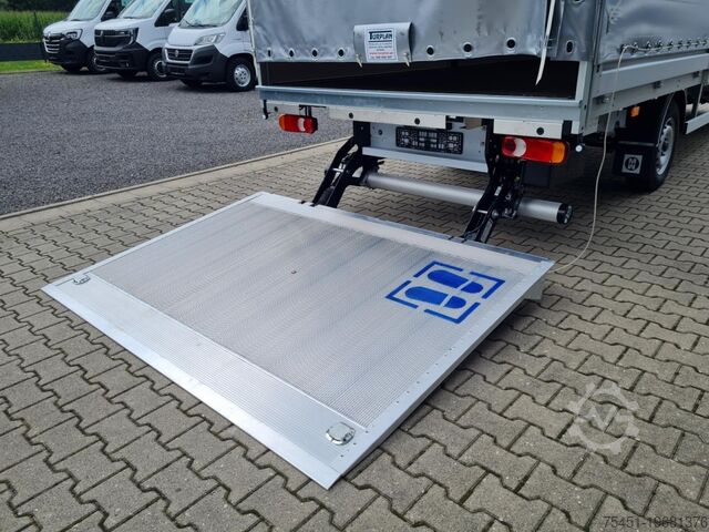 Tail lift, wind deflector, air conditioning, central locking with remote control, electrically adjustable and heated exterior mirrors, electric front windows, onboard computer, cruise control, multifunction steering wheel, light sensor, rain sensor, LED daytime running lights, radio, touchscreen, hands-free system, Apple CarPlay, Android Auto, air suspension, heat-insulating glazing, tachometer, driver’s airbag, anti-lock braking system (ABS), traction control (ASR), cab seats: driver's seat with lumbar support, particulate filter, immobilizer, side marker lights, outside temperature display, power steering, tail lift 750 kg, gross vehicle weight 3.50 t, body: flatbed with sliding curtain, gearshift indicator, cabin air filter: pollen filter, cab seats: mechanically suspended driver’s seat, cab seats: driver's seat with armrest, cab seats: multifunctional double passenger seat, cab seats: height-adjustable driver’s seat, overhead storage compartment, electronic brakeforce distribution, brake assist, height-adjustable steering column (steering wheel), electronic stability program (ESP), 185 A alternator, body/construction: flatbed, drive type: front-wheel drive, 6-speed manual transmission