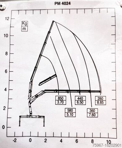 2-axle 75ptt truck, equipped with a 4.20x2.33m fixed body, 2200kg payload, PM series 4 crane with 4 hydraulic extensions, automatic transmission, Euro 5 standard.