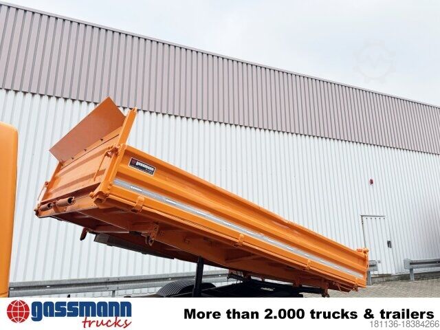 Wheelbase: 3020 mm Structure: Meiller 3-way tipping structure 4.1t front axle, rear axle hypoid 6.2t crown gear 325, differential lock in rear axle, electronic braking system with ABS and ASR, disc brakes on front and rear axles, stabilizer rear axle for extreme high loads, standard cockpit, construction site filter, ClassicSpace, daytime running lights, Meiller 5-piston pump type 254/1, engine brake, ESP, tank capacity: 120l, tipping platform floor with lashing recesses, auxiliary drive MB NA 60-1C with MPA!