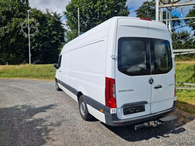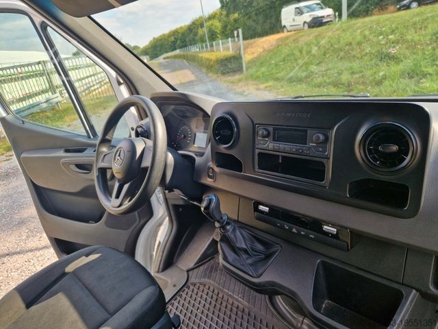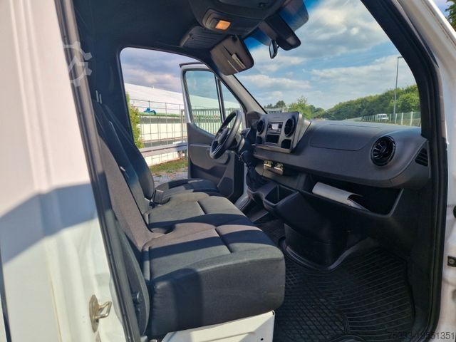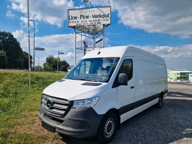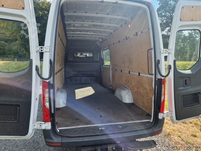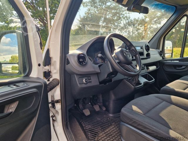 Third brake light, storage compartment above windshield, storage compartment below dashboard on passenger side, adaptive brake light, driver's side airbag, hill-start assist, traction control (ASR), washer fluid level indicator, electrically adjustable and heated exterior mirrors (both sides), outside temperature display, brake assist, roof lining in cab, automatic headlight activation, grab handle for sliding door at cargo partition, electronic brake force distribution (EBD), driver assistance system: Crosswind Assist, rear door (180-degree opening angle), body/superstructure: high-roof panel van, keyless start, child safety locks, communication module (LTE) for digital services, fuel tank: main tank 71 liters, steering wheel (mechanically adjustable steering column), headlight range adjustment, lateral marker lights, Mercedes-Benz emergency call system, engine 2.1 L - 105 kW CDI CAT, wheelbase 4325 mm, low emissions according to Euro 6 standard, sliding door right side cargo/passenger compartment, seat belt system with warning device (driver's side), seat upholstery/fabric: cloth, seats in cab: driver's seat adjustable, steel rims 6.5x16, Trailer Stability Assist (TSA), AGM battery 70 Ah, service interval indicator Assyst, approved gross vehicle weight 3.50 t