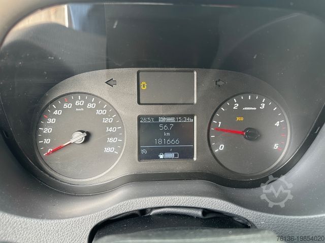 Overhead storage in driver's cab roof, 13-pin trailer socket, DAB tuner (digital radio reception), cargo area ceiling light with door contact, entry handle on right rear pillar, tachograph control at front under headliner, digital tachograph, vehicle without suspension lowering, 250 A alternator, rear doors (opening angle 270 degrees), wooden floor in cargo area, terminal strip for electrical connections (under driver's seat), fuel tank: main tank 93 litres, dashboard loading package (additional USB ports and 12V socket), LED cargo area lighting, cable duct at rear portal, cable duct on side wall, multimedia system MBUX (7" touchscreen), parking package with reversing camera, cross member with integrated step, smoker's package, spare wheel with regular tyres, spare wheel holder under end of frame incl. jack, seats in driver's cab: double passenger seat, seats in driver's cab: driver's seat with lumbar support, driver's cab seats: comfort suspension seat, driver's side, driver's cab seats: low seat base, high wood paneling in cargo/body area (up to roof), load-securing rails in cargo area - side wall at belt rail, reinforced front axle, jack, heat-insulating glazing (windscreen with top band filter)