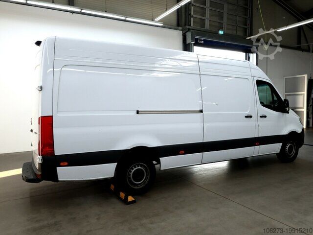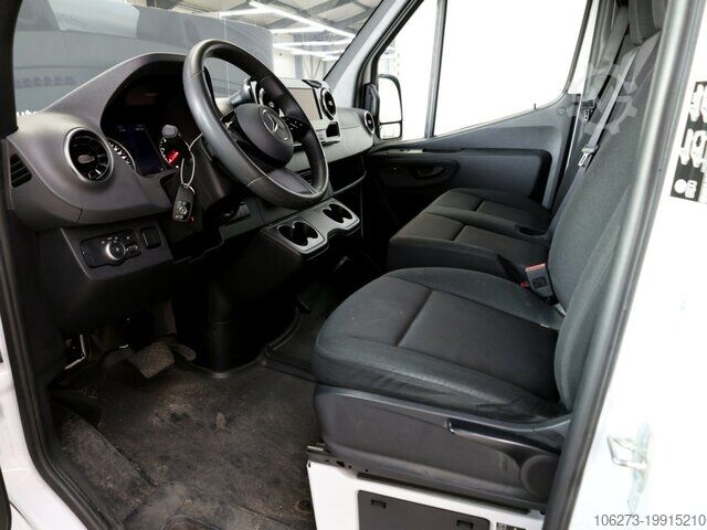 A50 Front axle with increased load capacity, AR2 Axle ratio i = 3.923, BA3 Active brake assist, BH1 HOLD function, C6L Multifunction steering wheel, CL1 Adjustable steering column (height and tilt), CT1 Vibration damper, D03 High roof, D51 Full partition wall with 1 window, E07 Hill start assist, E1D Digital radio (DAB), E1U USB socket 5 V, E3D Preparation for DSP box, E3J Preparation for switch module, E5 Trailer socket prewiring, E7B Navigation prewiring, E7M MBUX multimedia system, ES5 Instrument panel charging package, EW6 Preparation for Remote Services Plus, EY5 Mercedes-Benz emergency call system, EY6 Breakdown management, F1 Cab coat hook, F2 Winter package, F64 Electrically folding exterior mirrors, F68 Heated and electrically adjustable exterior mirrors, FF5 Overhead storage compartment above front windscreen, FG8 Front cupholder, FJ4 Under-cockpit storage, FM3 Wet Wiper System, G49 G-TRONIC, H15 Passenger seat heating, H16 Driver's seat heating, H2 Heat-insulating glass with band filter on windscreen, HH9 TEMPMATIC semi-automatic climate control, IR6 Wheelbase 4325 mm, rear overhang 1615 mm, IT4 3.5 tons, J55 Seatbelt warning device for passenger seat, J58 Seatbelt warning device for driver’s seat, J65 Outside temperature display, JA7 Blind Spot Assist.