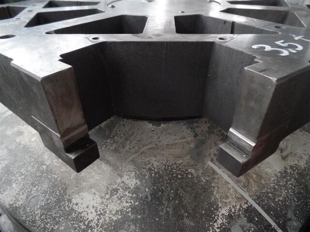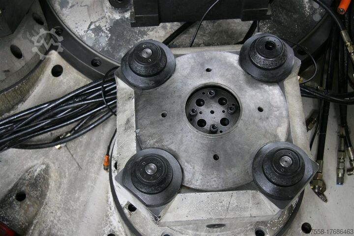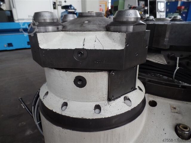 5-кратный поворотный стол, в виде правильного пятиугольника на корпусе станка, центральная окружность Ø = 1280 мм, конструкция стола в виде усеченного квадрата 380x380 мм, зажимное устройство посредством 4 зажимных устройств Röhm в форме усеченного конуса и 1 центрального центрирующего фланца, вращение на 360°, Ø заготовки ок. 730 мм