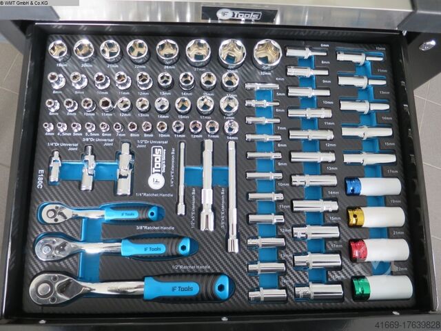 17 торцевых головок от 8 мм до 32 мм, 9 длинных головок от 10 мм до 22 мм.