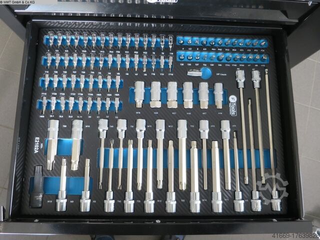 Инструментальная тележка с 8 выдвижными ящиками, заполненными инструментами.