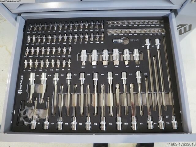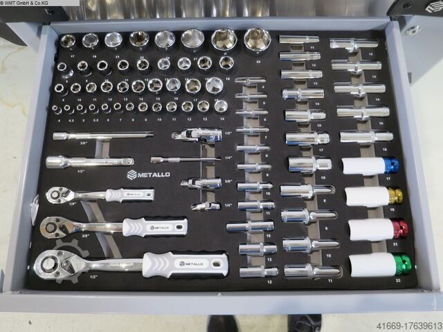 17 торцевых головок от 10 мм до 30 мм, 9 длинных головок от 10 мм до 24 мм.
