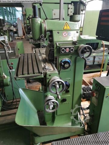 Оснащение: стационарный стол, вертикальная головка с выдвижной пинолью, цифровая индикация по 3 осям HEIDENHAIN, различные короткие и длинные фрезерные оправки, различные цанги, оригинальный инструментальный шкаф DECKEL.