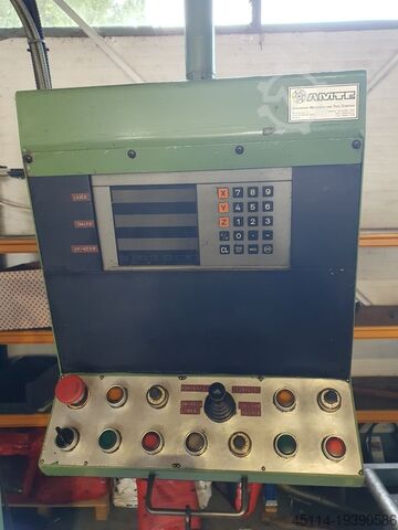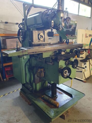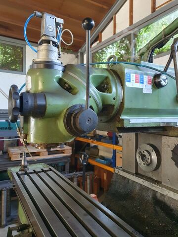 Тяжелый универсальный фрезерный станок с конусом шпинделя ISO-40. Оборудование: машинные тиски, вертикальная фрезерная головка (система HURON) с выдвижной пинолью для сверления, устройство для затяжки инструмента, цифровая индикация и различные держатели инструмента.