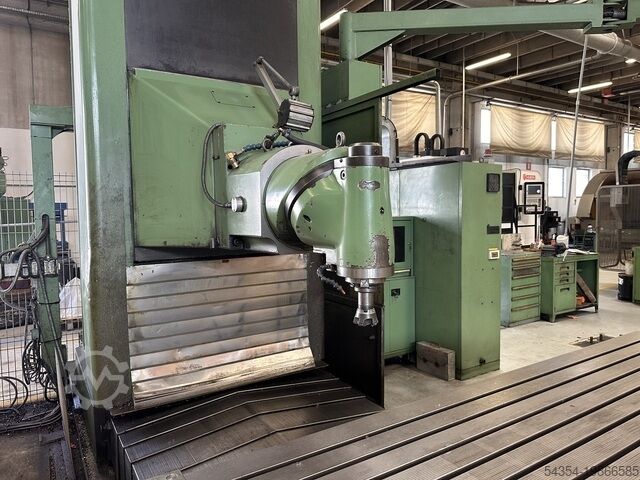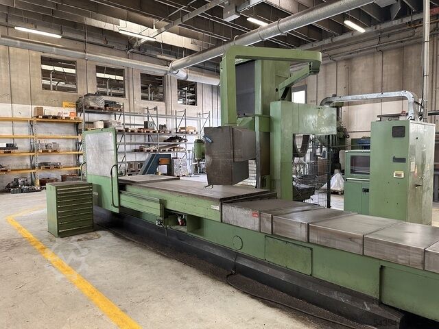 Универсальный стругальный фрезерный станок Sachman T20. Серийный номер 166987 (1993) с ЧПУ Heidenhain 407, перемещения X/Y/Z = 3600/1200/1200 мм, размер стола 3800 x 1100 мм, магазин инструментов на 30 позиций, мощность шпинделя 24 кВт, конус шпинделя ISO 50, транспортер стружки, установленная мощность 69 кВт, масса станка 17 000 кг.