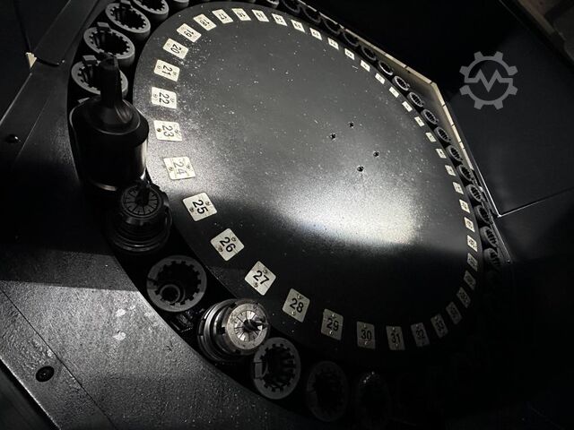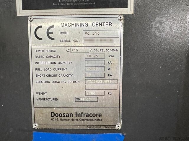 Вертикальный обрабатывающий центр Doosan VC510 с двумя паллетами и ЧПУ Doosan Fanuc серии i, размер стола 2 x 860 x 570 мм, максимальная высота заготовки 520 мм, скорость вращения шпинделя 10 000 об/мин, конус шпинделя BT40, 40 ATC инструмента, ход по оси X 762 мм, ход по оси Y 516 мм, ход по оси Z 570 мм, насосы и оборудование WPB 10-1000 Hydrajet система охлаждения высокого давления, охладитель Kaukan, транспортер стружки LNS Turbo HB. Серийный номер MV 0061-000242 (2013) Вес станка 9500 кг, различные инструменты для шпинделя BT40