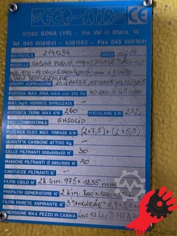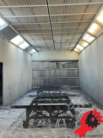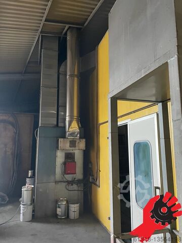Внутренние размеры кабины: длина 14,06 м X ширина 5,04 м X высота 4 м, максимальный воздушный поток: 40-45000 мк/ч, тепловая мощность: 260 кВт, топливо: дизельное, установленная электрическая мощность: 26 кВт трехфазная, бак топливный в комплекте, в кабине имеется специальная система освещения, 30 превосходных фильтрующих элементов для очистки углем, габариты: 500x500x50 мм, боковая сервисная дверь, две центральные распашные двери, тележка для запчастей, дымоход горелки на дизельном топливе, к кабине прилагается руководство по эксплуатации и техническому обслуживанию